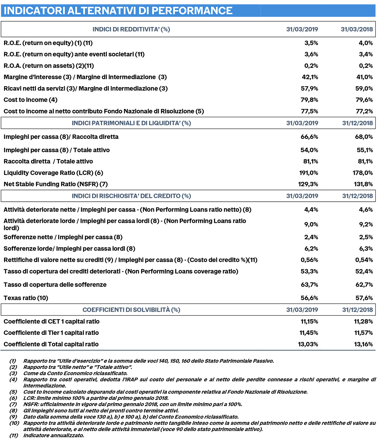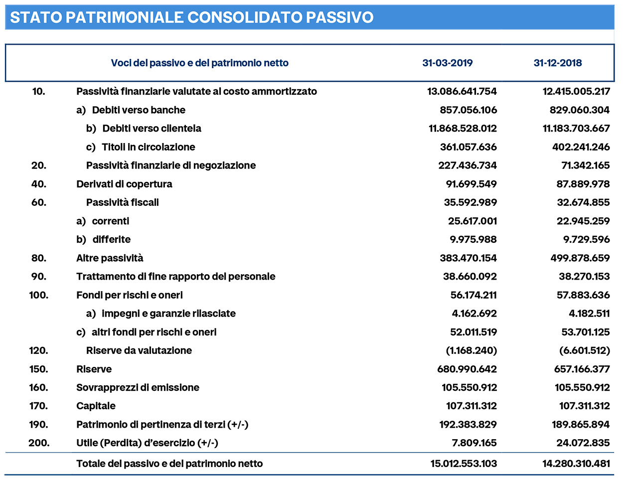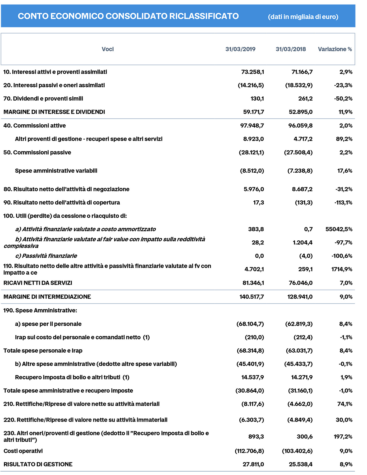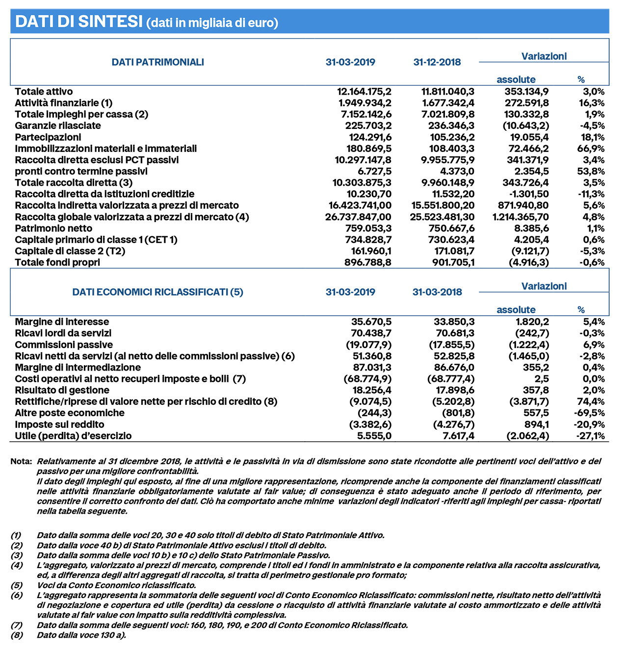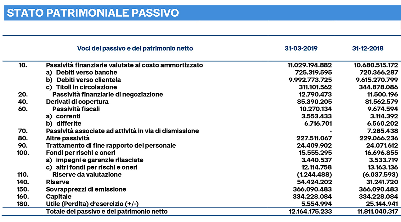 La raccolta globale al valore di mercato è cresciuta del 4,8%, raggiungendo i 26,7 miliardi di euro. La componente di raccolta diretta è cresciuta del 3,5%, attestandosi a 10,3 miliardi di euro. Gli impieghi, a supporto delle attività di famiglie e imprese, sono cresciuti dell'1,9%, attestandosi a 7,2 miliardi di euro. L'Npl Ratio netto è ulteriormente migliorato, scendendo al 4,3%. L'indice Texas Ratio della banca, che misura la capienza del patrimonio e degli accantonamenti rispetto ai rischi di credito, è migliorato scendendo al 62,6%, rispetto al 63,8% del 2018, confermandosi tra i migliori del settore bancario italiano.