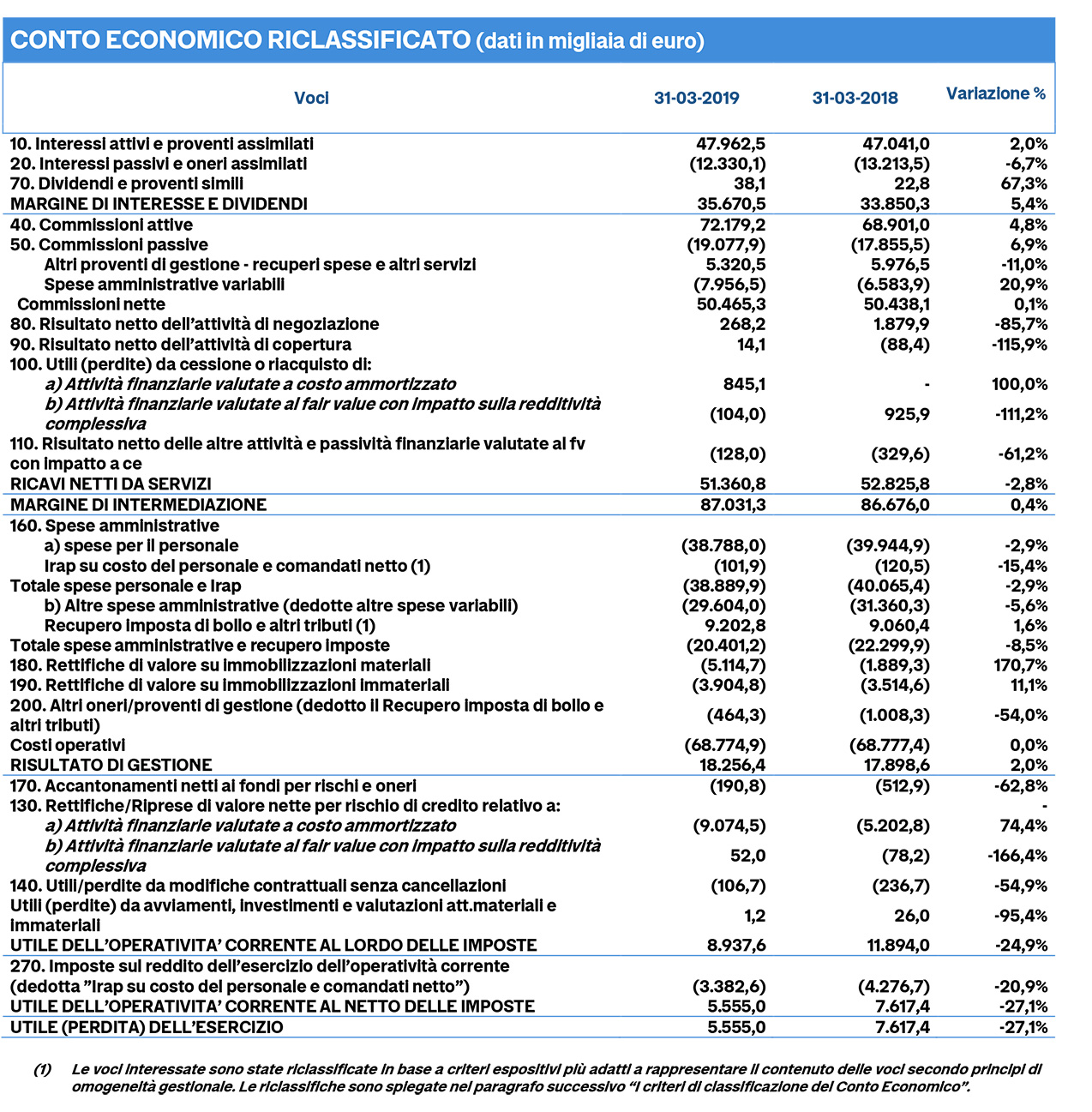 Rispetto allo stesso periodo dell'anno precedente il margine di interesse è cresciuto del 5,4%, a 35,7 milioni di euro, e il margine di intermediazione è cresciuto dello 0,4%, a 87 milioni di euro. I ricavi netti da servizi sono diminuiti del 2,8%, attestandosi a 51,4 milioni di euro.