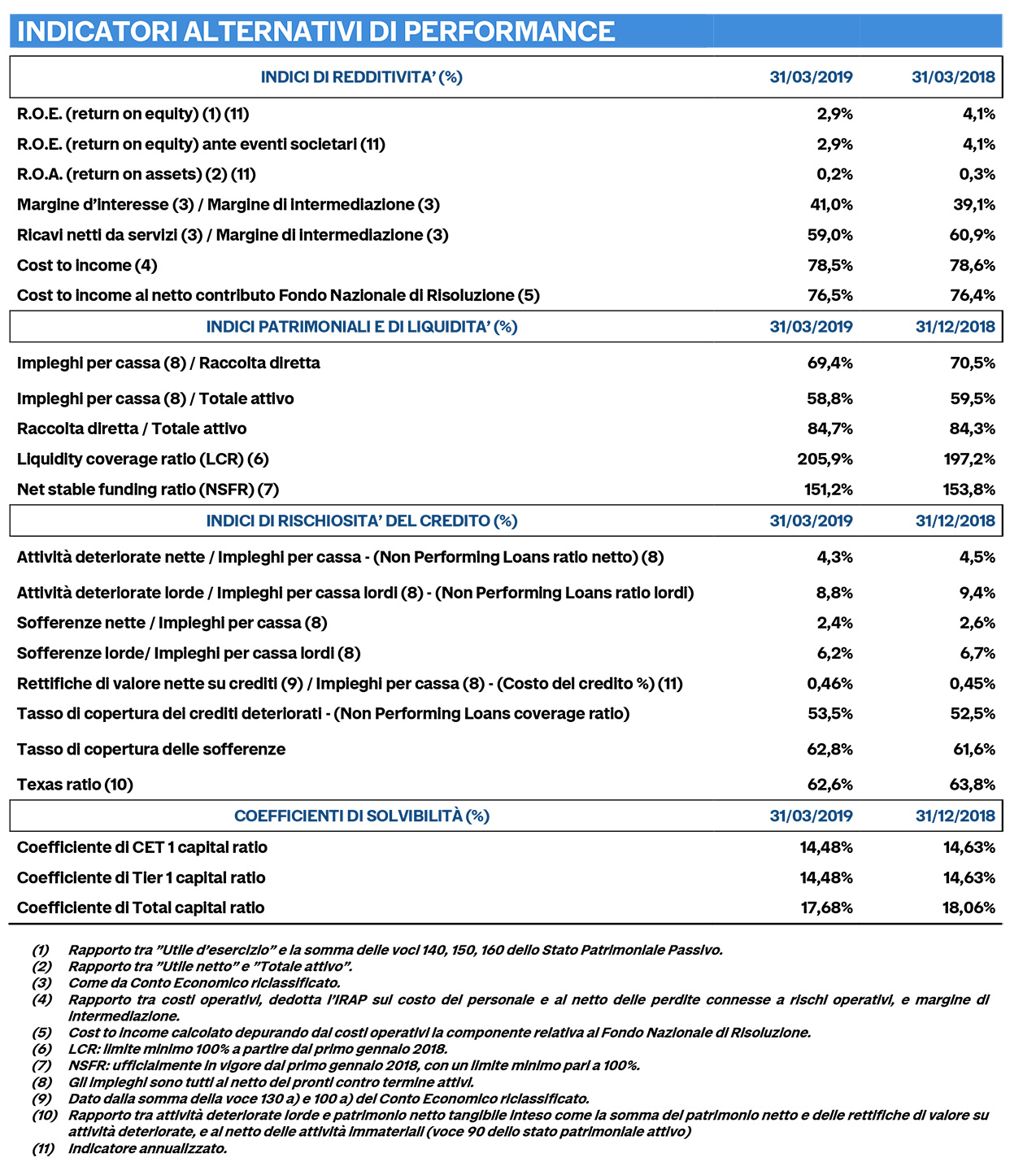 Confermata l'elevata solidità patrimoniale, con un Cet1 del 14,48% e un Total Capital Ratio del 17,68% (erano 14,63% e 18,06% a fine 2018). Positivi gli indicatori relativi alla liquidità: l'indice LCR è pari a 205,9%, mentre l'indice NSFR è pari a 151,23% (per entrambi gli indicatori i limiti minimi previsti sono pari al 100%).