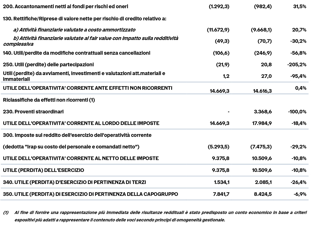 Confermata la solida posizione patrimoniale. Il Cet1, infatti, si è attestato a 11,15% e il Total Capital Ratio a 13,03%, entrambi ampiamente superiori alle soglie richieste. Positivi gli indicatori relativi alla liquidità: l'indice LCR è pari a 191%, mentre l'indice NSFR è pari a 129,29%. Positivo anche l'andamento della raccolta: quella globale al valore di mercato è cresciuta del 4,7%, raggiungendo i 37,4 miliardi di euro, e la raccolta diretta è cresciuta del 5,6% attestandosi a 12,2 miliardi di euro. Gli impieghi sono cresciuti del 3,6% a 8,3 miliardi di euro. In crescita i ricavi netti (+7% a 81,3 milioni di euro), il margine di interesse (+11,9% a 59,2 milioni di euro) e il margine di intermediazione (+9% a 140,5 milioni di euro).