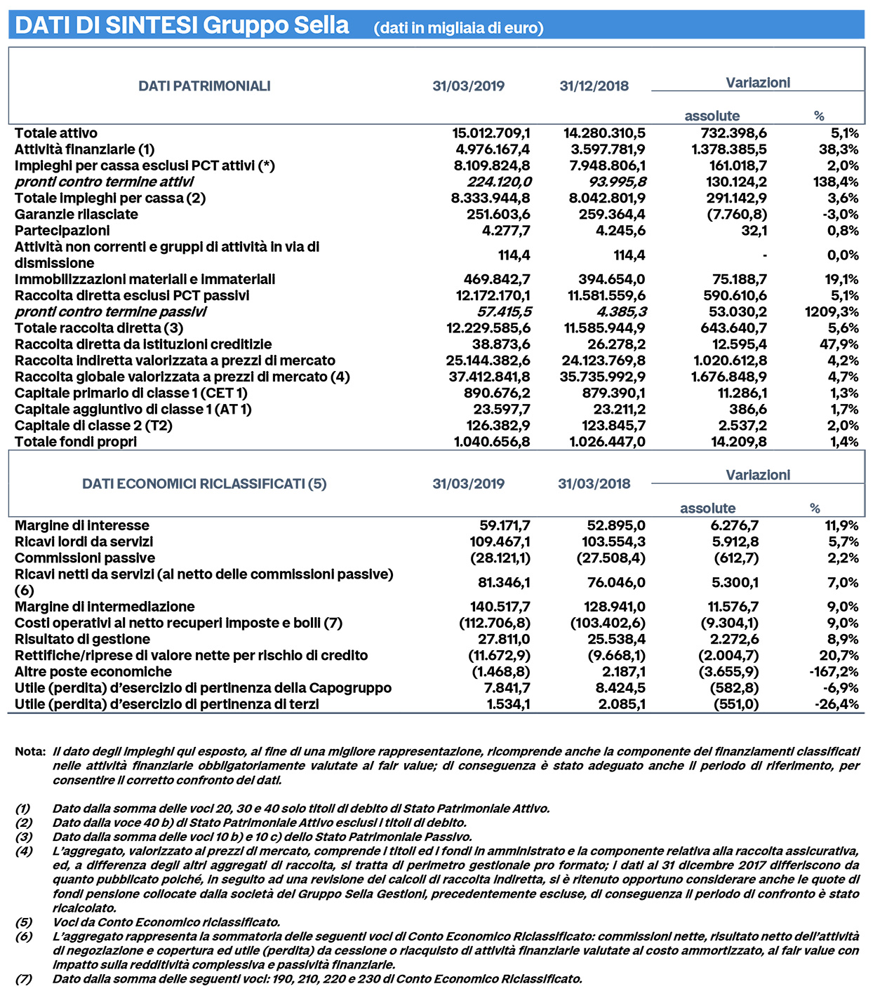 Il Consiglio d'amministrazione di Banca Sella ha approvato i risultati al 31 marzo 2019, che si sono chiusi con un risultato positivo, evidenziato dalla crescita della raccolta e degli impieghi e dalla conferma dell'elevata solidità patrimoniale. L'utile netto del trimestre è stato pari a 5,6 milioni di euro, in diminuzione rispetto ai 7,6 milioni di euro dello stesso periodo dell'anno precedente, in particolare per effetto di maggiori accantonamenti sui crediti.