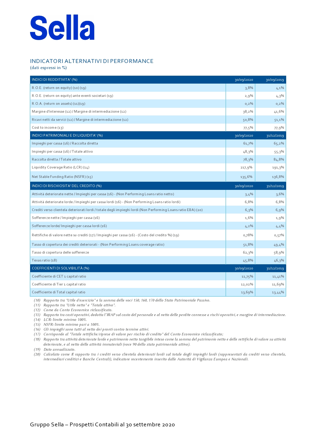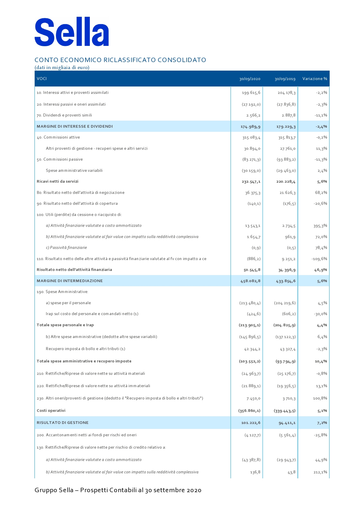 Sella: positivi i risultati dei primi nove mesi del 2020
