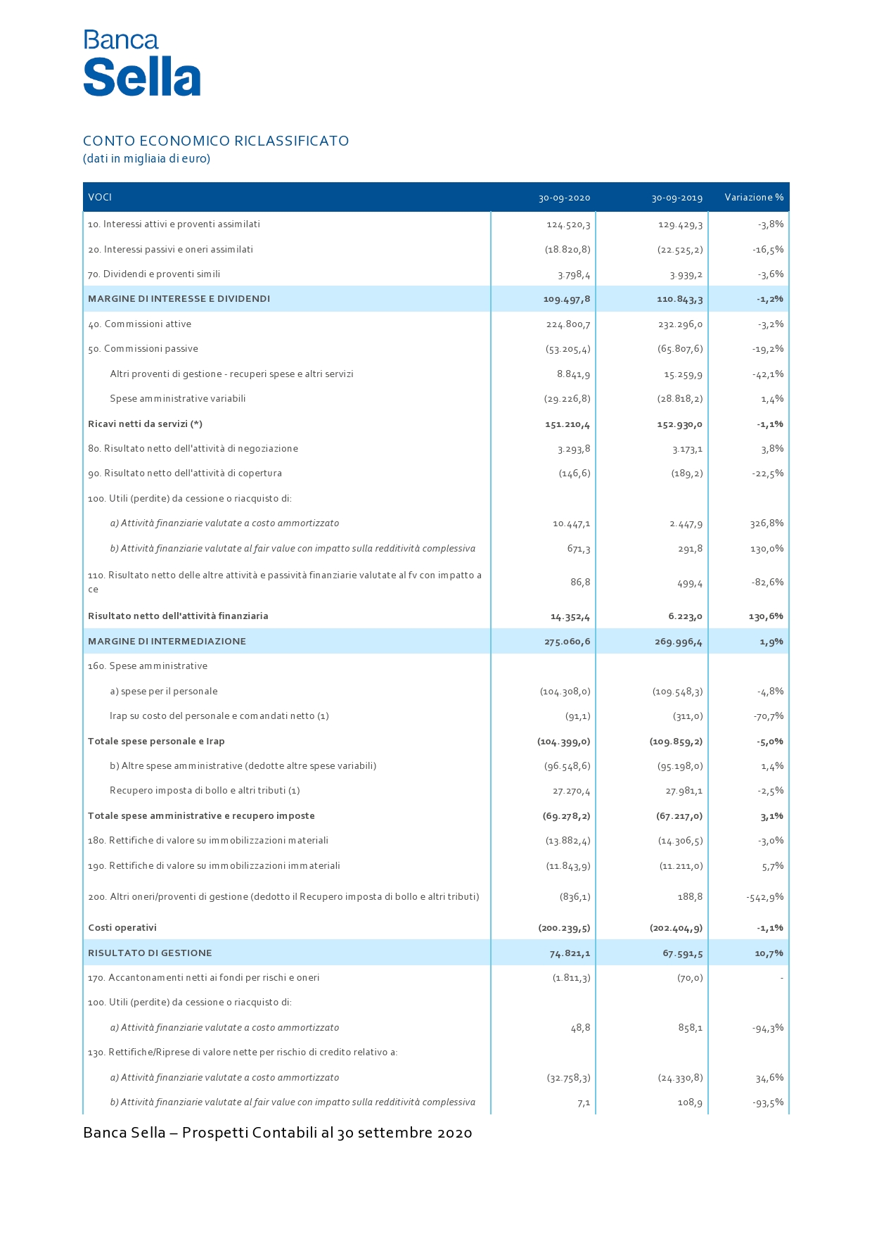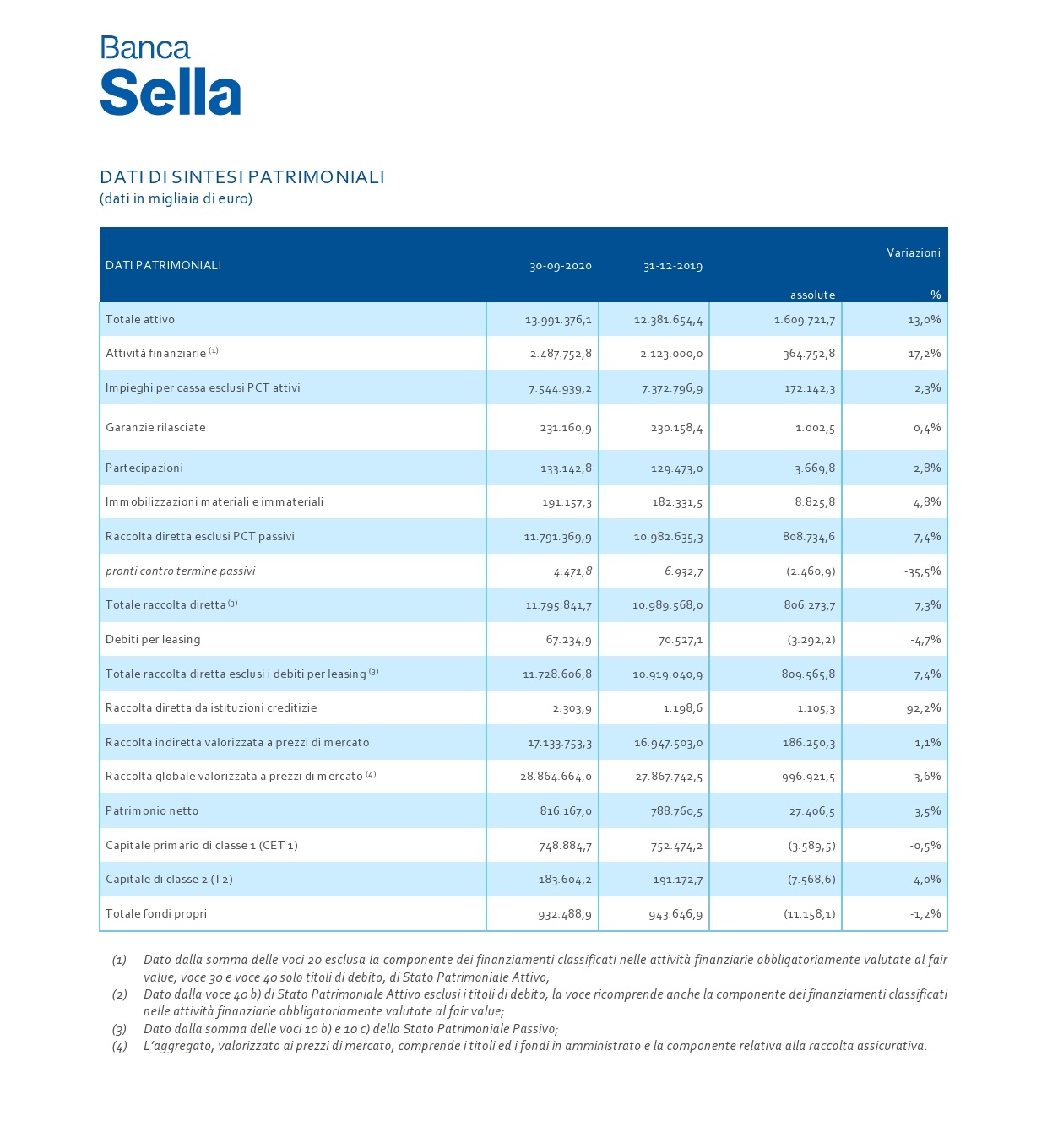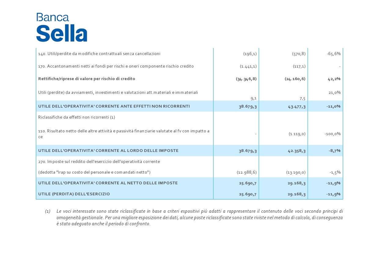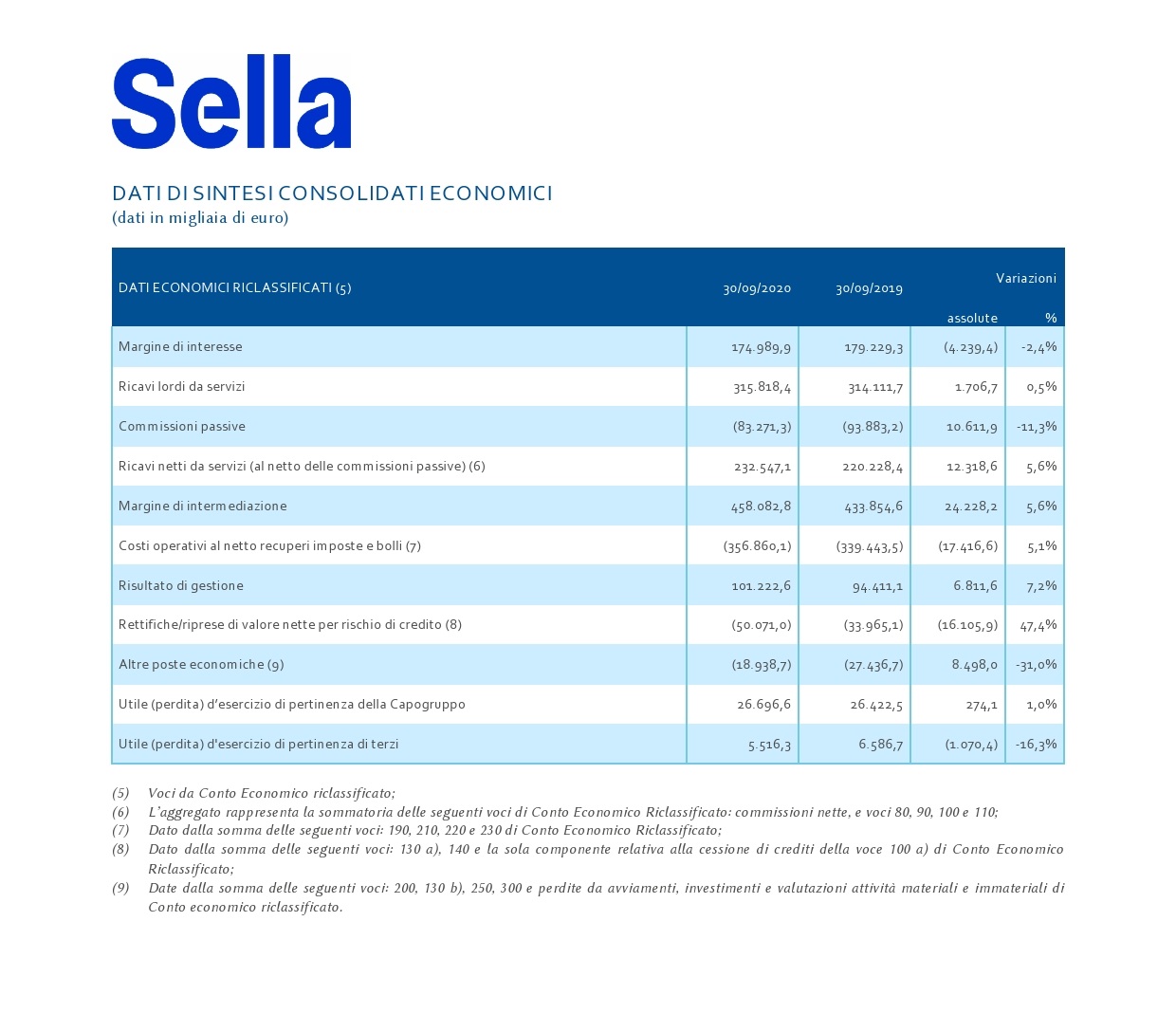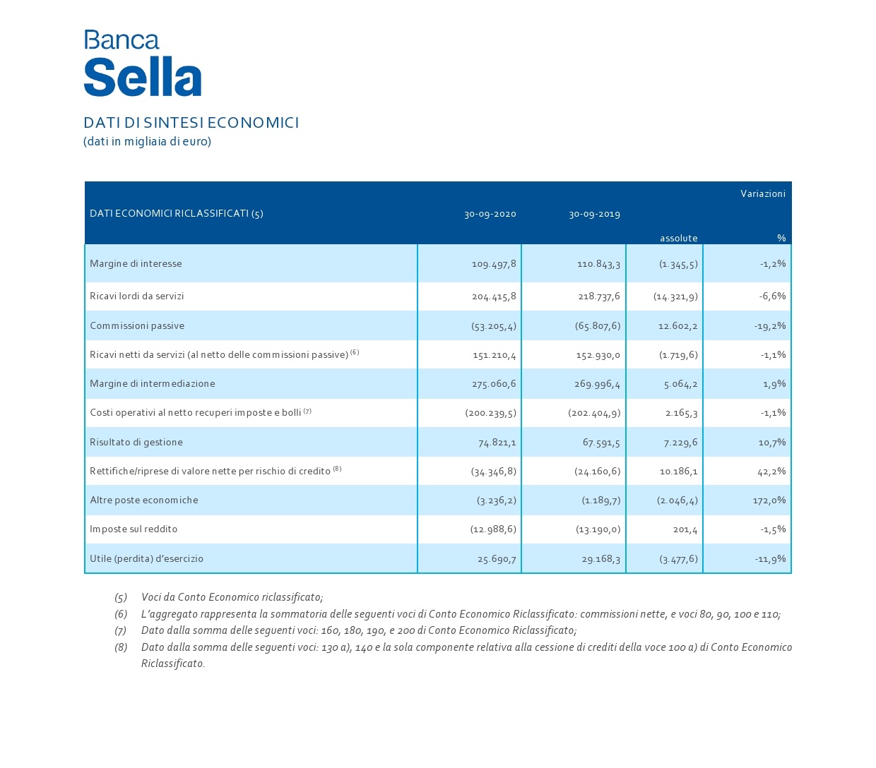 I risultati al 30 settembre 2020 di Banca Sella si sono chiusi con un utile netto di 25,7 milioni di euro, in leggera flessione rispetto ai 29,2 milioni di euro dello stesso periodo dell'anno precedente, principalmente per effetto delle maggiori rettifiche prudenziali per il rischio di credito, pari a 10,2 milioni di euro, per possibili ulteriori impatti futuri, non ancora manifestatisi, legati allo scenario macroeconomico generale determinato dal Covid-19.