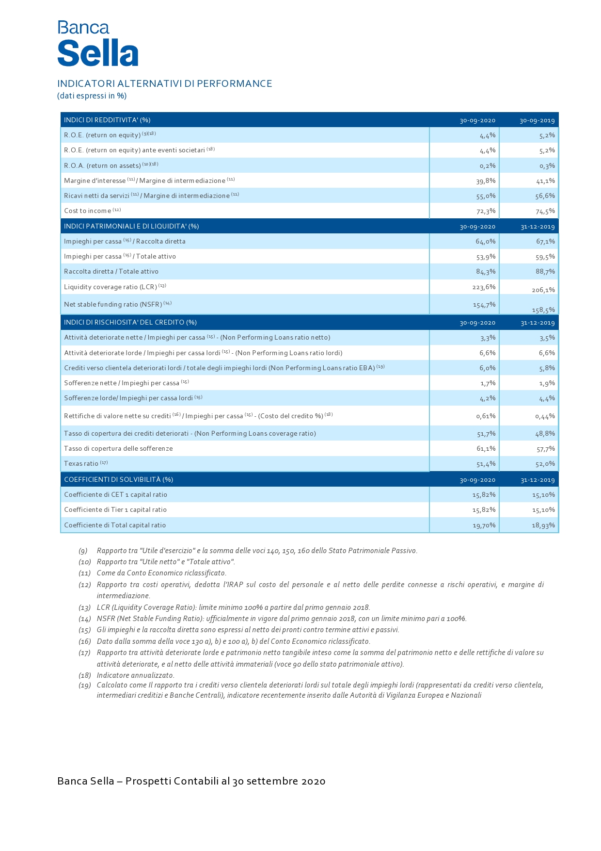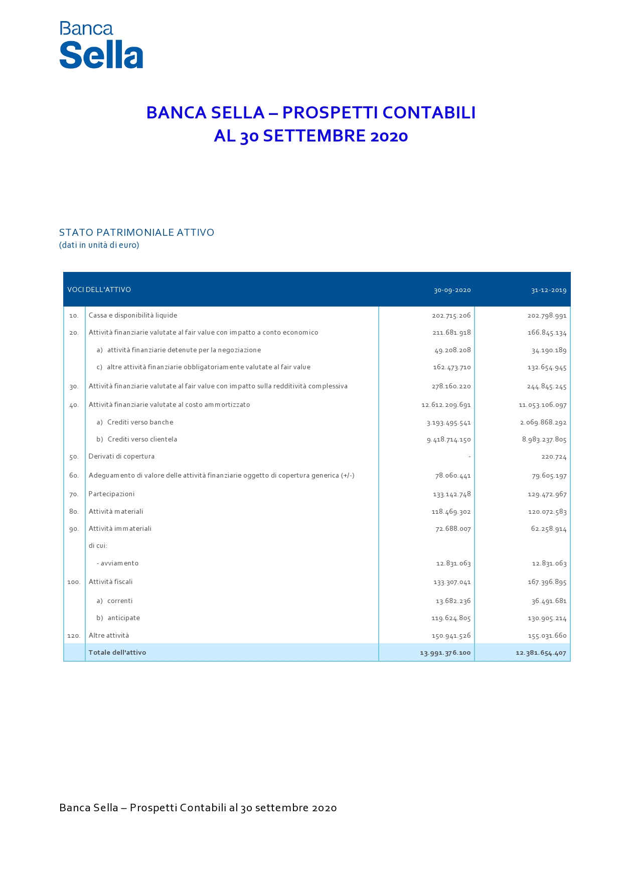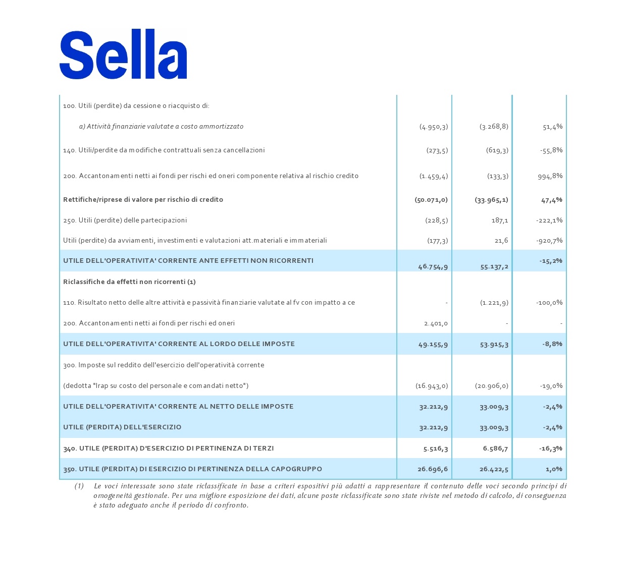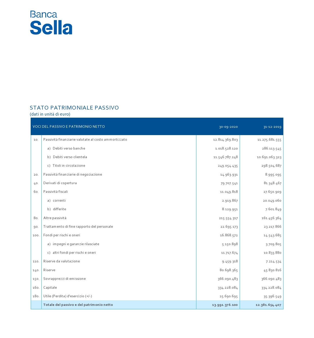 I risultati al 30 settembre 2020 di Banca Sella si sono chiusi con un utile netto di 25,7 milioni di euro, in leggera flessione rispetto ai 29,2 milioni di euro dello stesso periodo dell'anno precedente, principalmente per effetto delle maggiori rettifiche prudenziali per il rischio di credito, pari a 10,2 milioni di euro, per possibili ulteriori impatti futuri, non ancora manifestatisi, legati allo scenario macroeconomico generale determinato dal Covid-19.