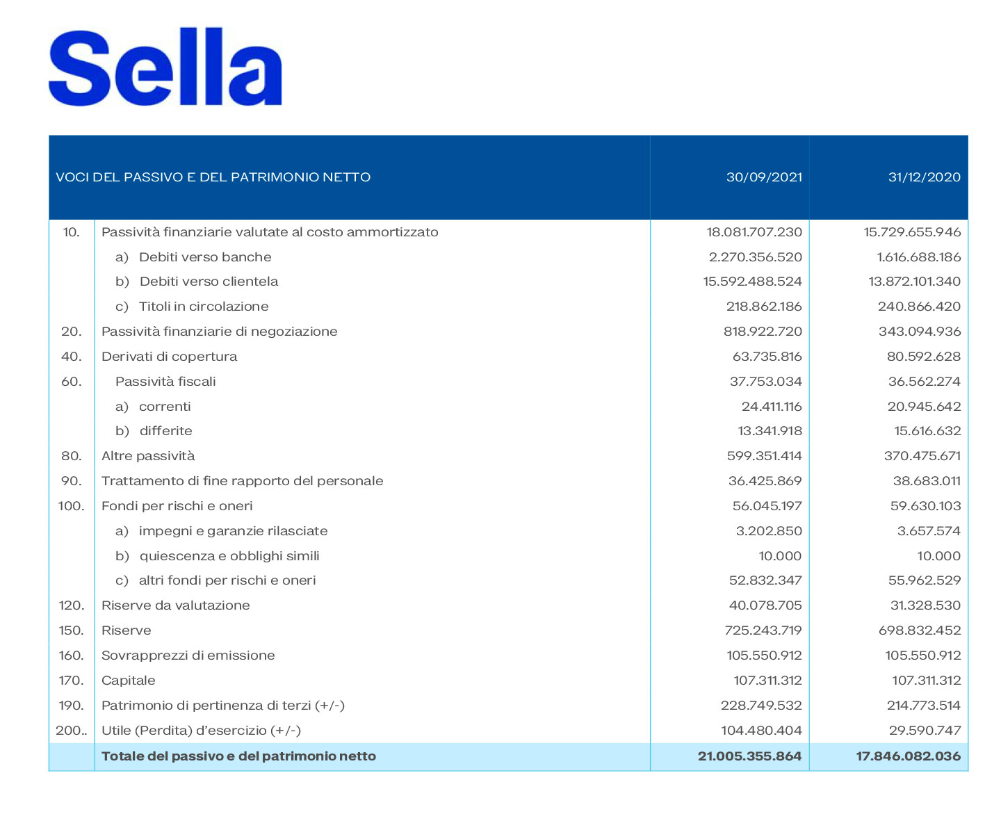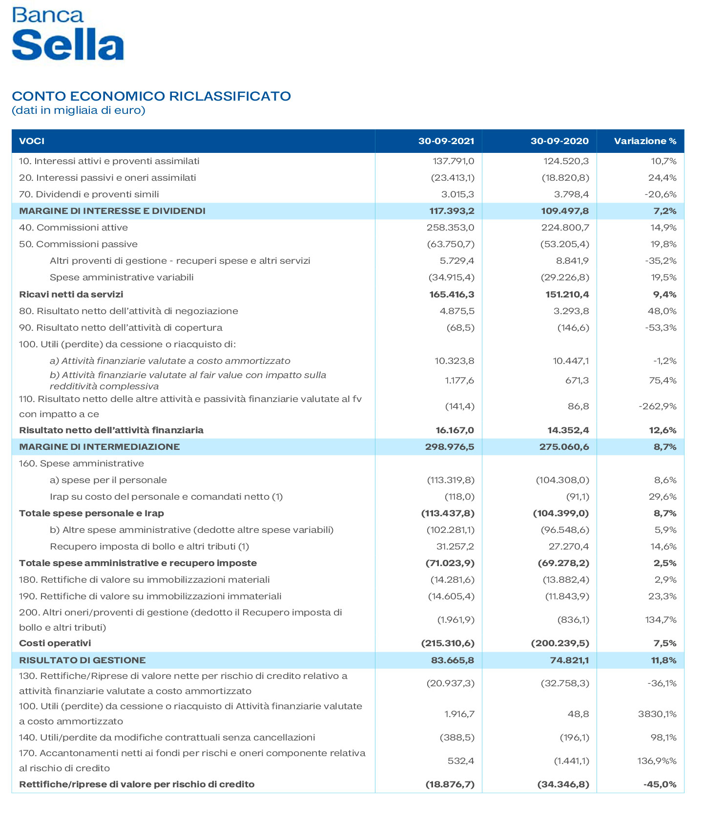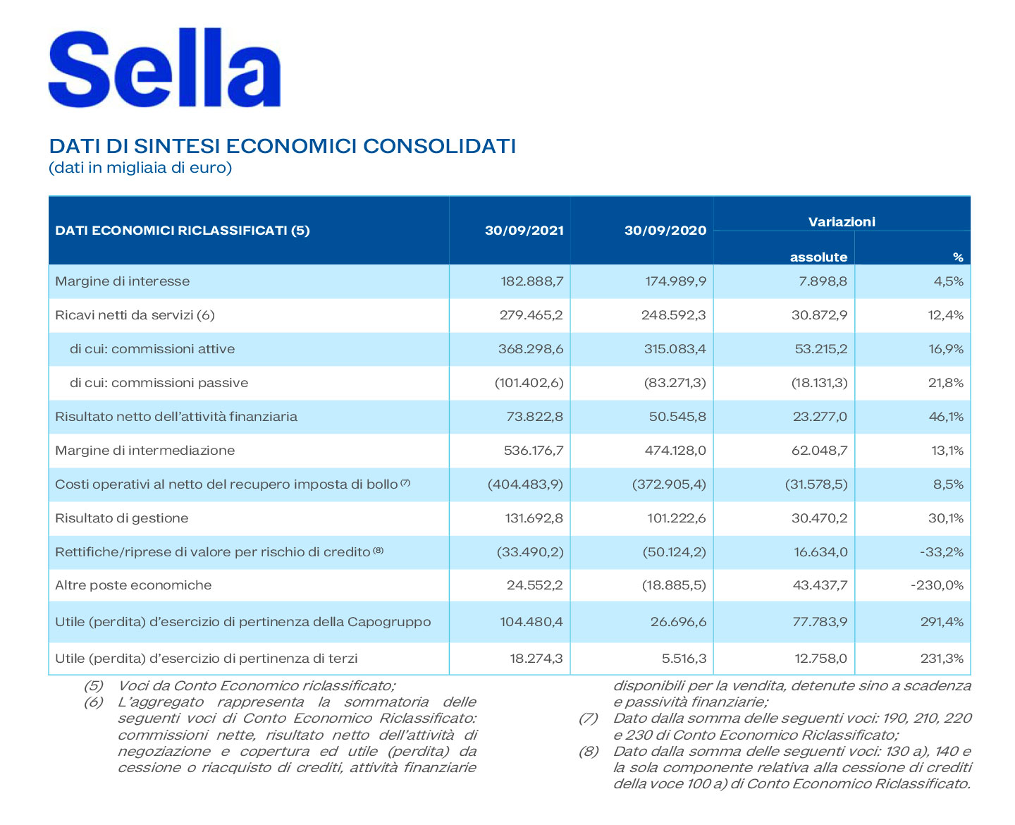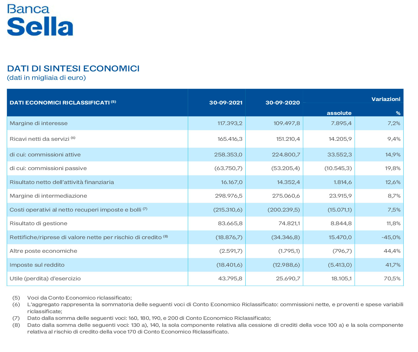Nel quadro dei risultati consolidati positivi si inserisce anche il buon andamento di Banca Sella, società emittente titoli diffusi. I risultati al 30 settembre 2021, approvati oggi dal Consiglio d'amministrazione della banca, si sono chiusi con un utile netto di 43,8 milioni di euro, in crescita rispetto ai 25,7 milioni di euro dello stesso periodo dell'anno precedente.