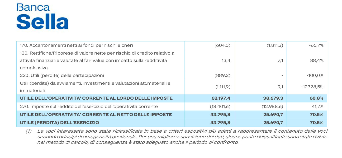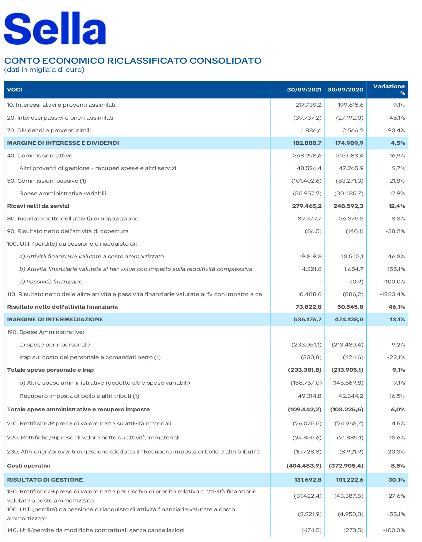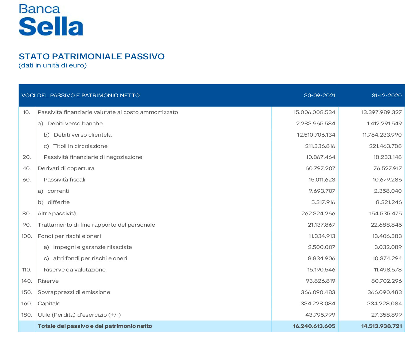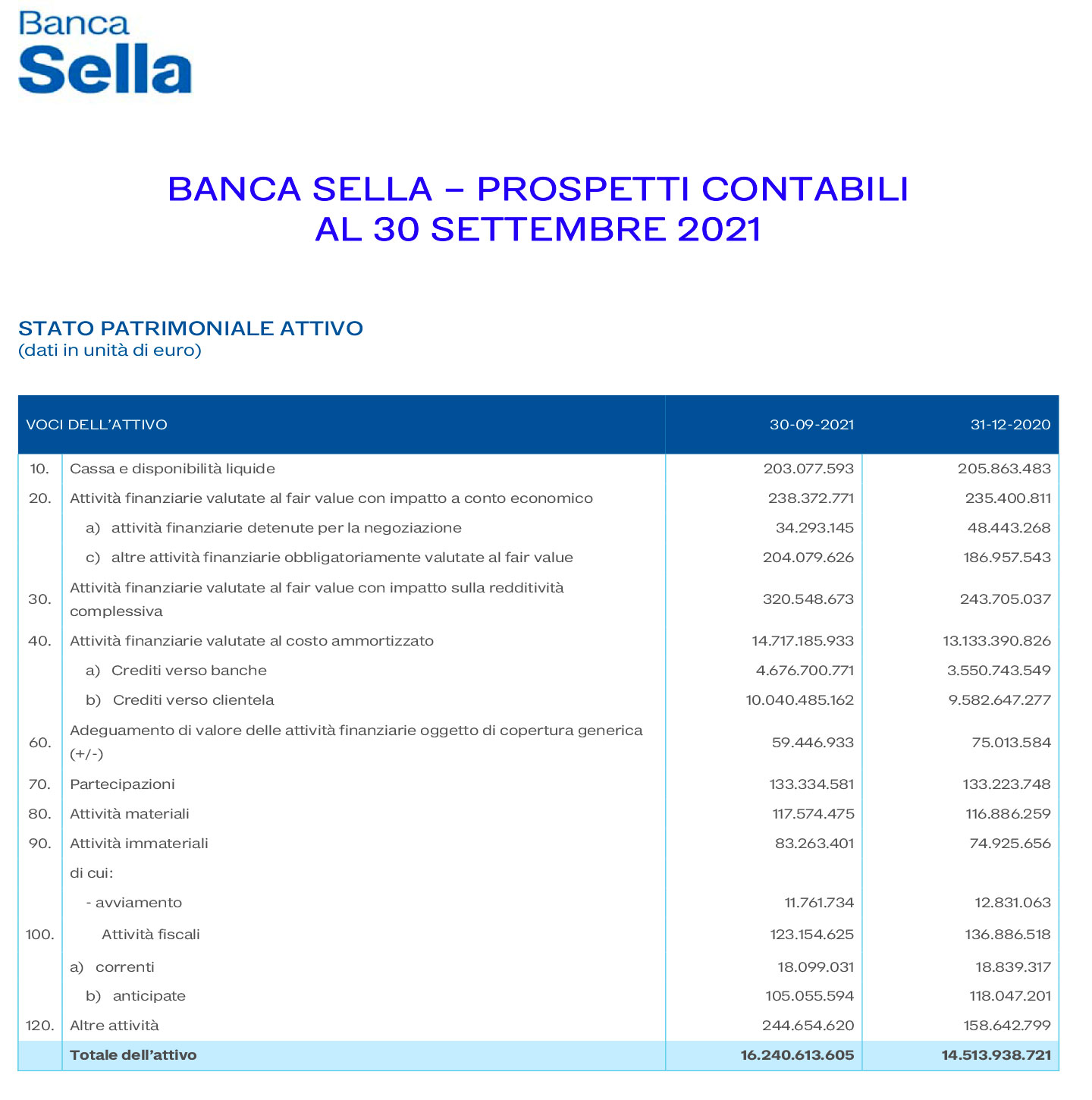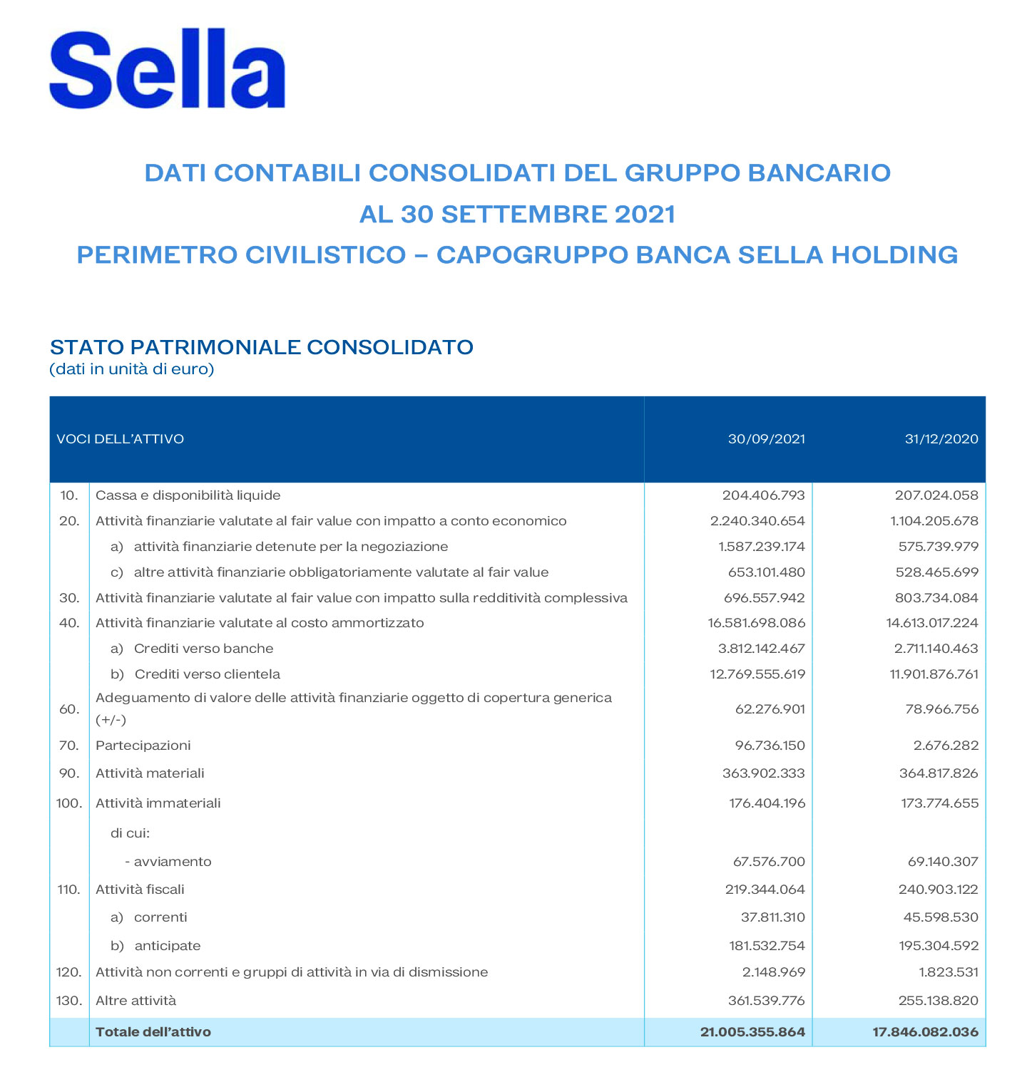 Nel quadro dei risultati consolidati positivi si inserisce anche il buon andamento di Banca Sella, società emittente titoli diffusi. I risultati al 30 settembre 2021, approvati oggi dal Consiglio d'amministrazione della banca, si sono chiusi con un utile netto di 43,8 milioni di euro, in crescita rispetto ai 25,7 milioni di euro dello stesso periodo dell'anno precedente.