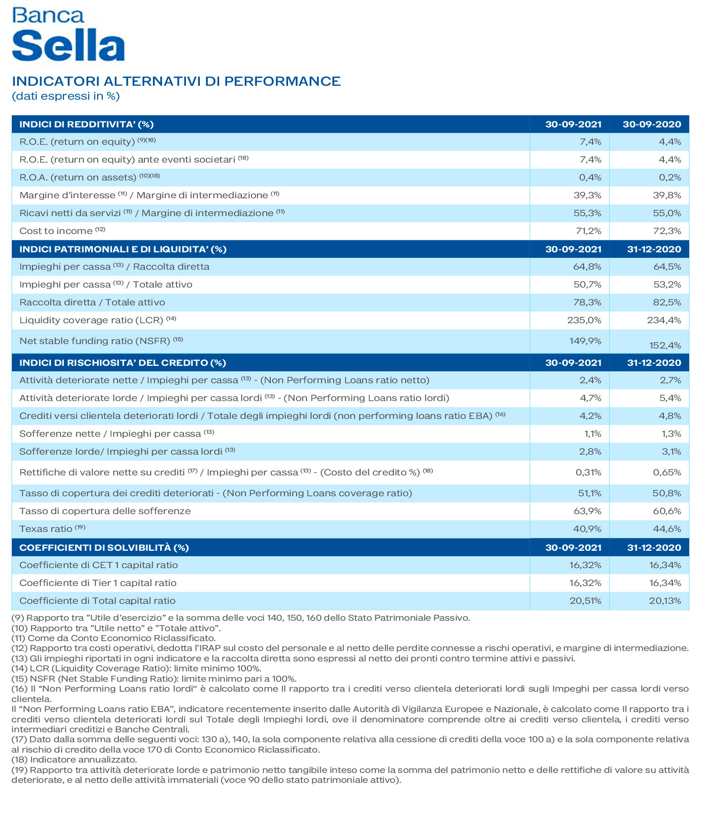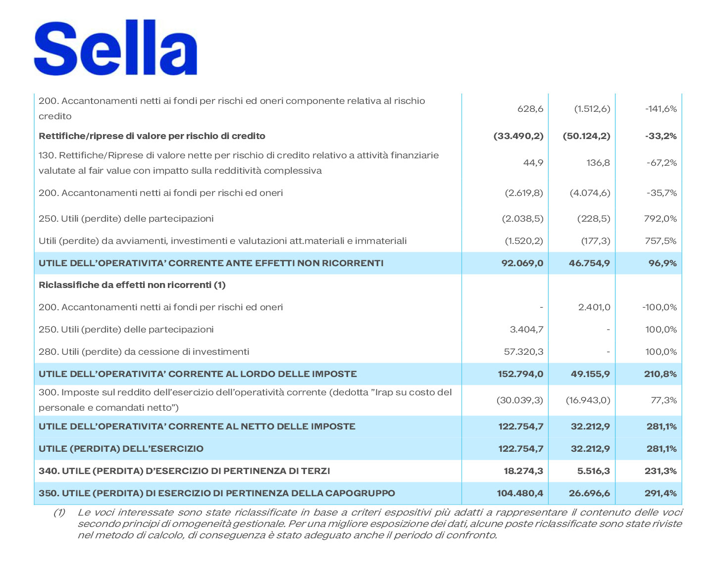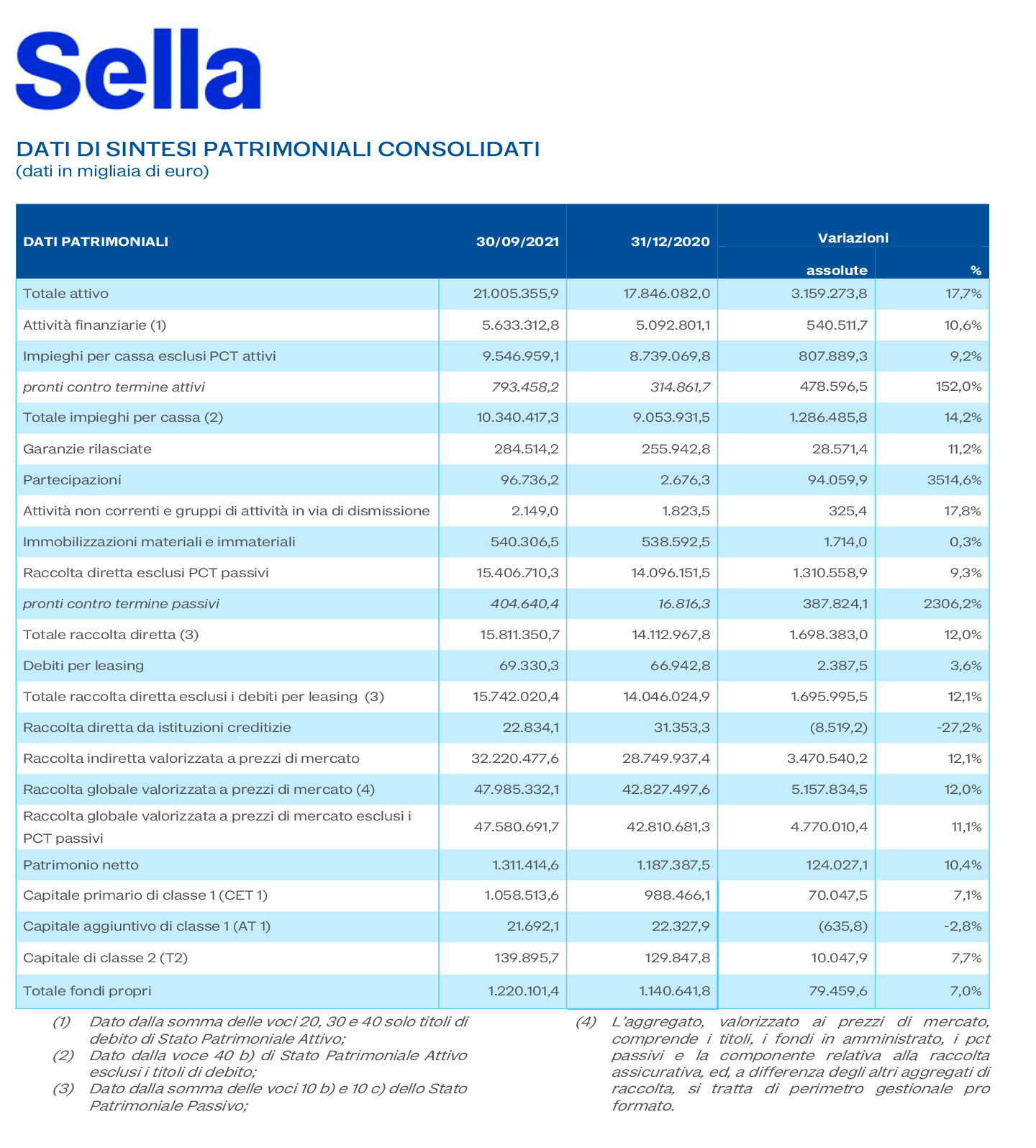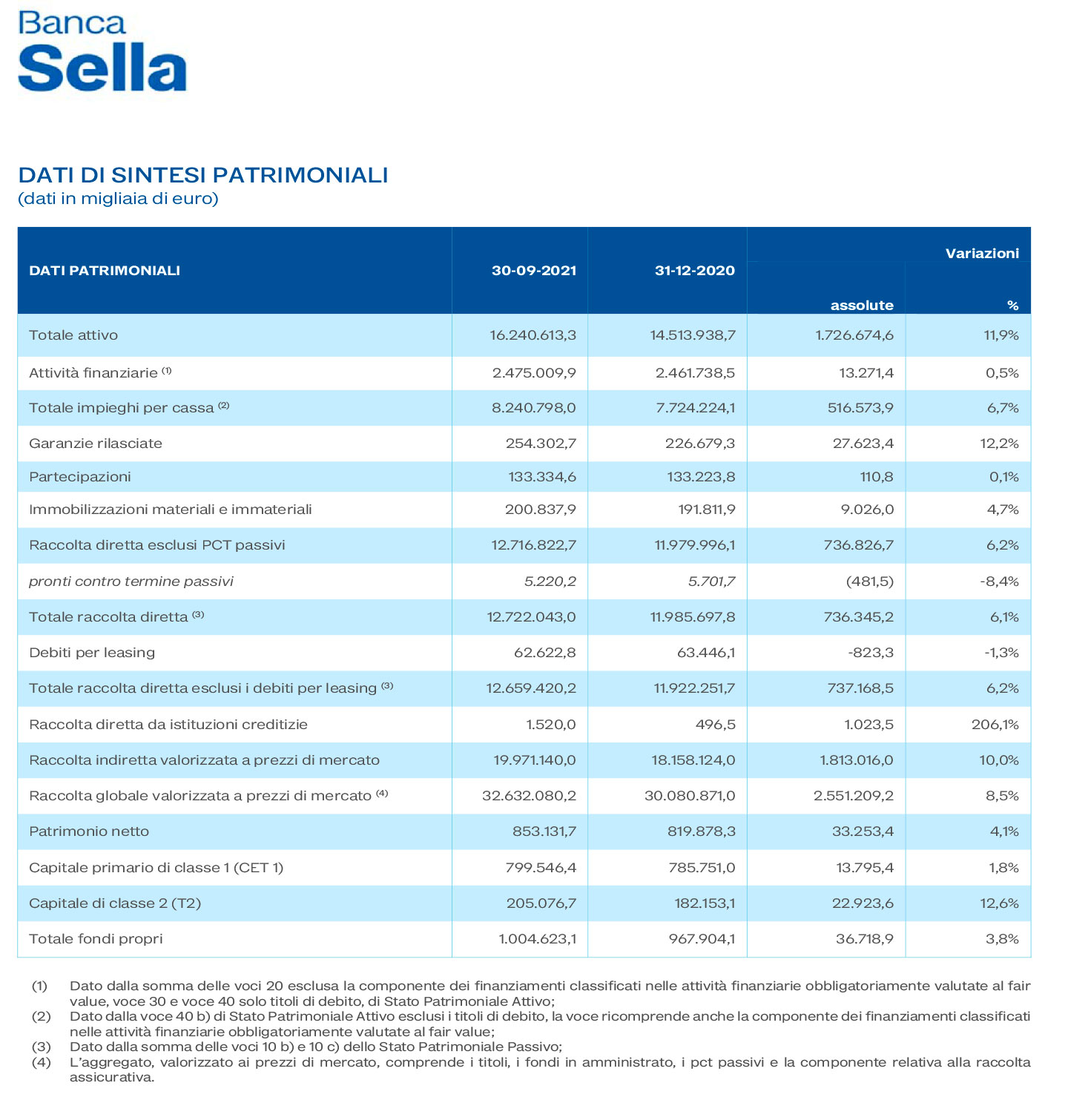 Nel quadro dei risultati consolidati positivi si inserisce anche il buon andamento di Banca Sella, società emittente titoli diffusi. I risultati al 30 settembre 2021, approvati oggi dal Consiglio d'amministrazione della banca, si sono chiusi con un utile netto di 43,8 milioni di euro, in crescita rispetto ai 25,7 milioni di euro dello stesso periodo dell'anno precedente.