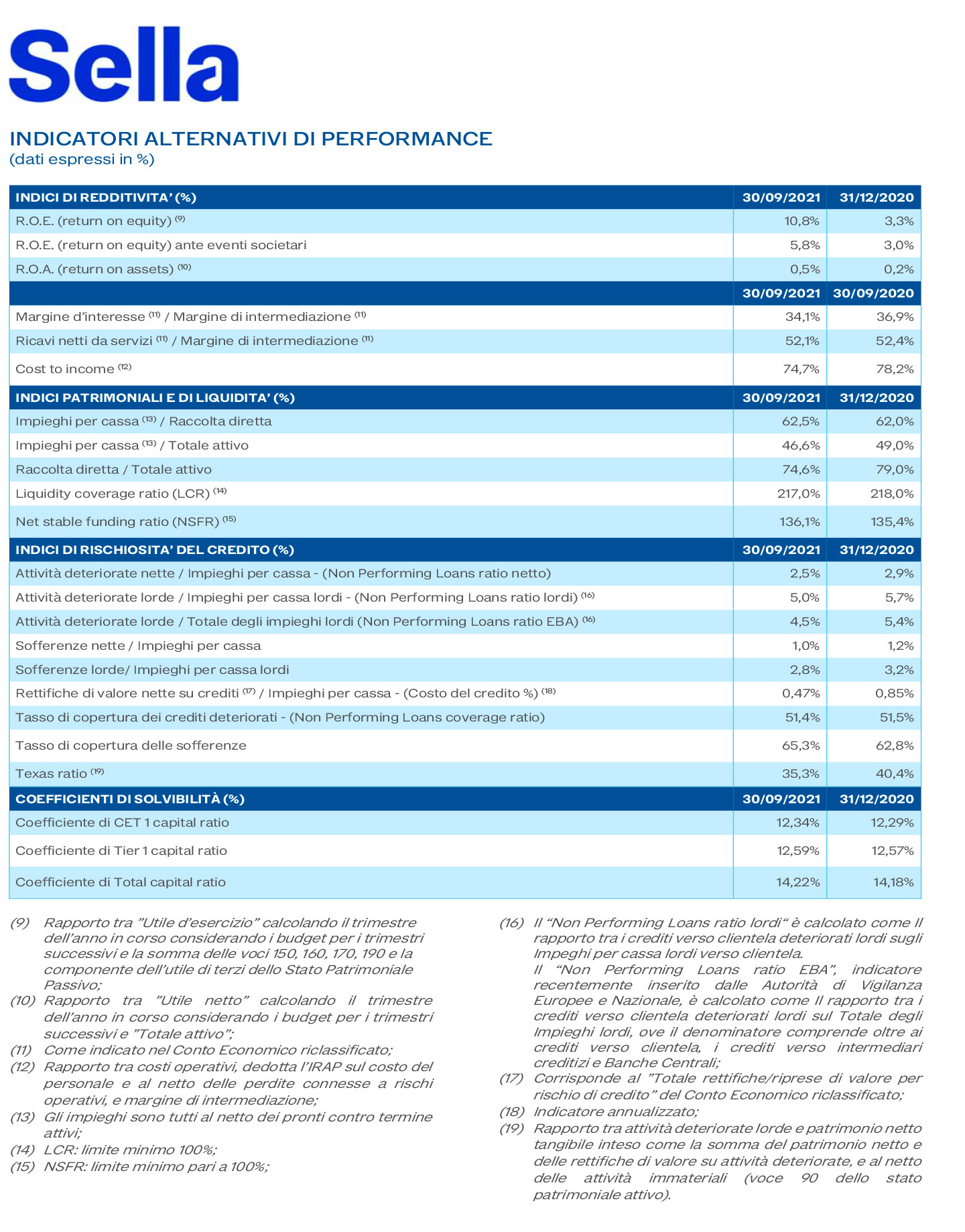 Migliorano gli indici di qualità del credito. L'Npl Ratio netto è diminuito al 2,5% (era 2,9% a fine 2020). Il Texas Ratio è ulteriormente migliorato portandosi al 35,3% (era 40,4% a fine 2020). Il costo del rischio di credito annualizzato al 30 settembre 2021 è stato pari a 47 bps (era 85 bps a fine 2020).