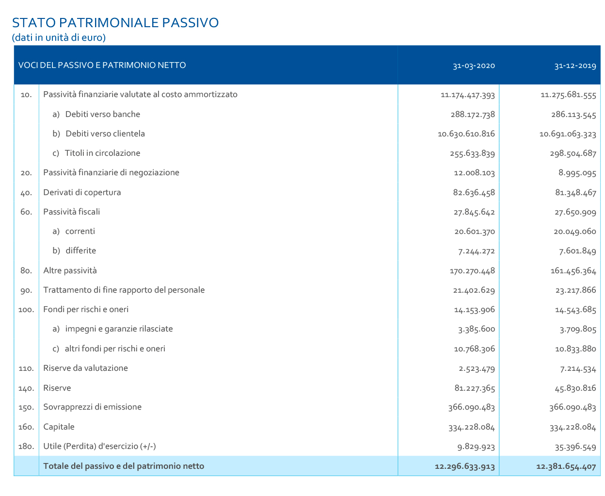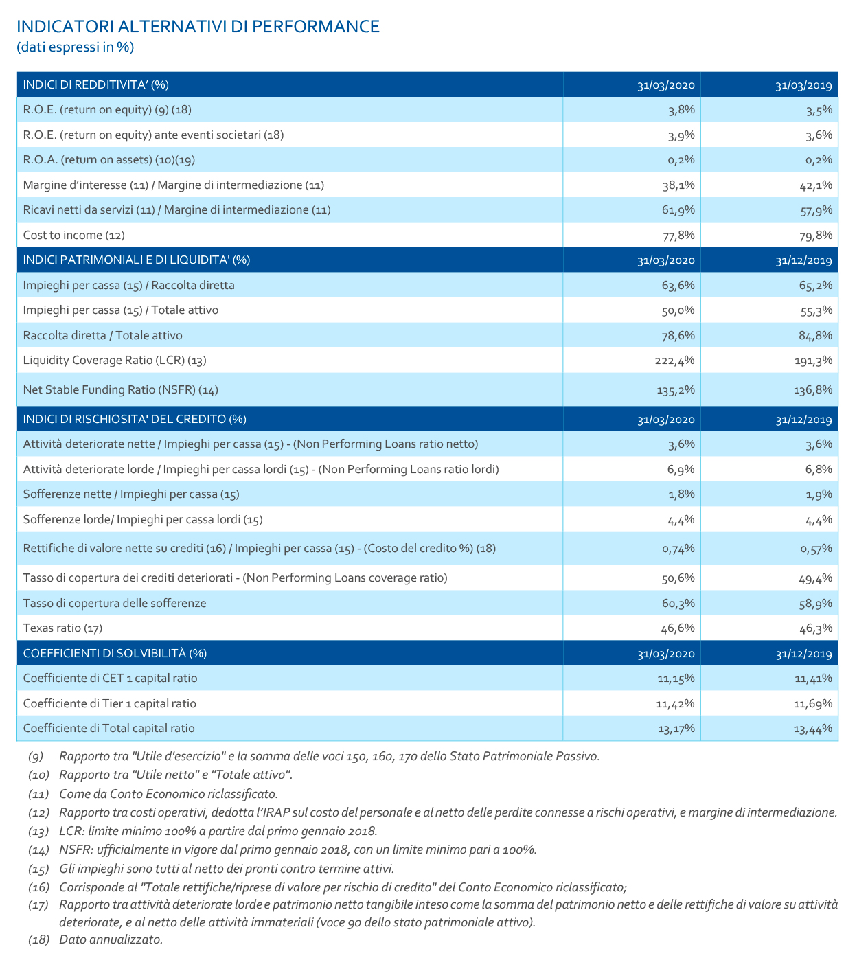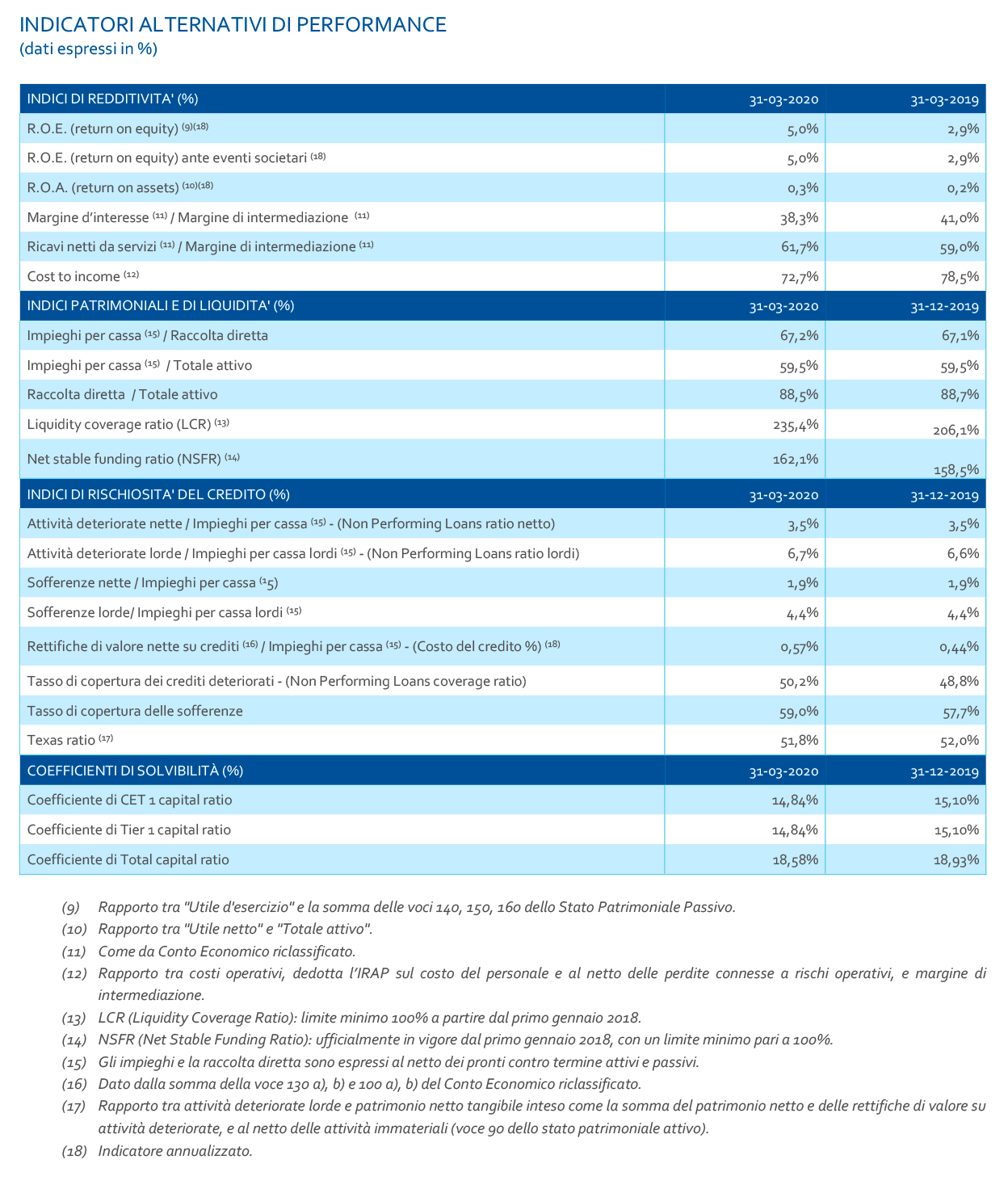 Gli impieghi, comprensivi dei Pct, sono cresciuti del 7,2% a 9 miliardi di euro, mentre gli impieghi al netto dei Pct sono sostanzialmente stabili a 8,3 miliardi di euro (-0,2%). Il costo del rischio di credito nel trimestre è stato pari a 0,74%. I dati della trimestrale, però, incorporano solo parzialmente gli effetti del lockdown causato dall'emergenza Covid-19 ed è quindi prevedibile che nel corso dell'anno tale costo subirà un incremento per attestarsi a fine anno intorno ad un livello pari o marginalmente superiore all'1%. Tale stima è stata effettuata con riferimento alle previsioni macroeconomiche e settoriali di consensus ad oggi, e non potrà che essere affinata e ricalcolata in base all'effettivo scenario economico dei prossimi mesi. In crescita i ricavi netti (+15,1% a 94 milioni di euro) e il margine di intermediazione (+7,9% a 151,9 milioni di euro), mentre è diminuito il margine di interesse (-2,1 % a 57,9 milioni di euro).