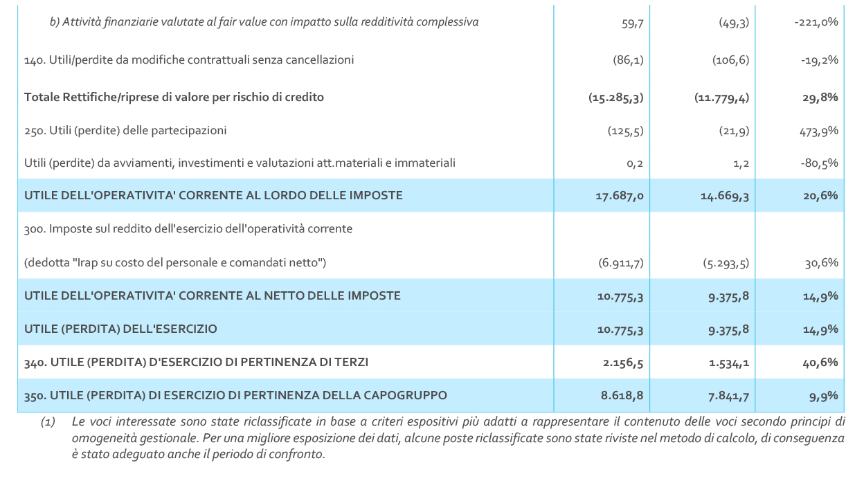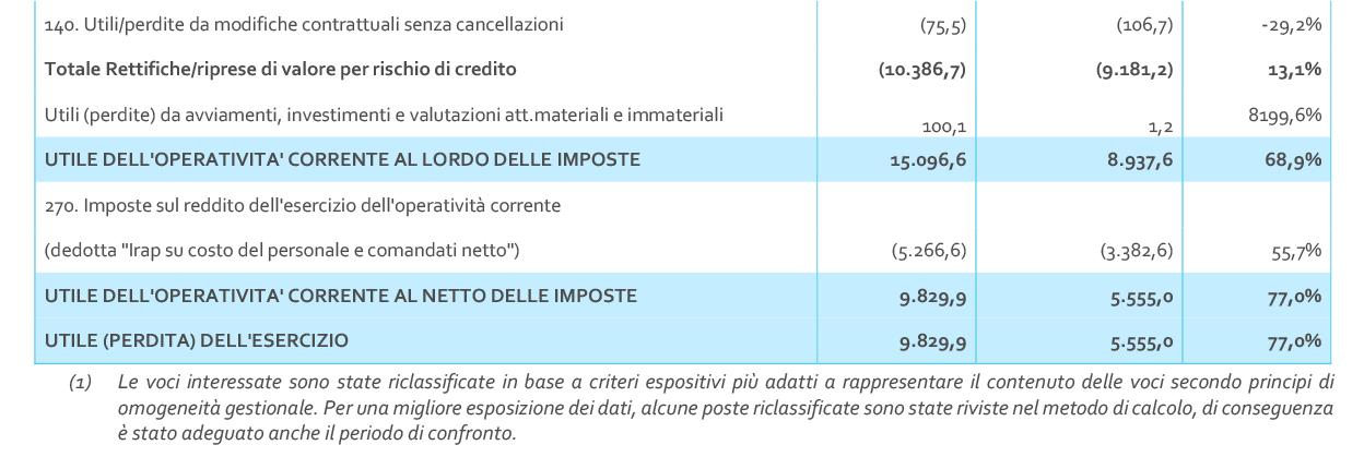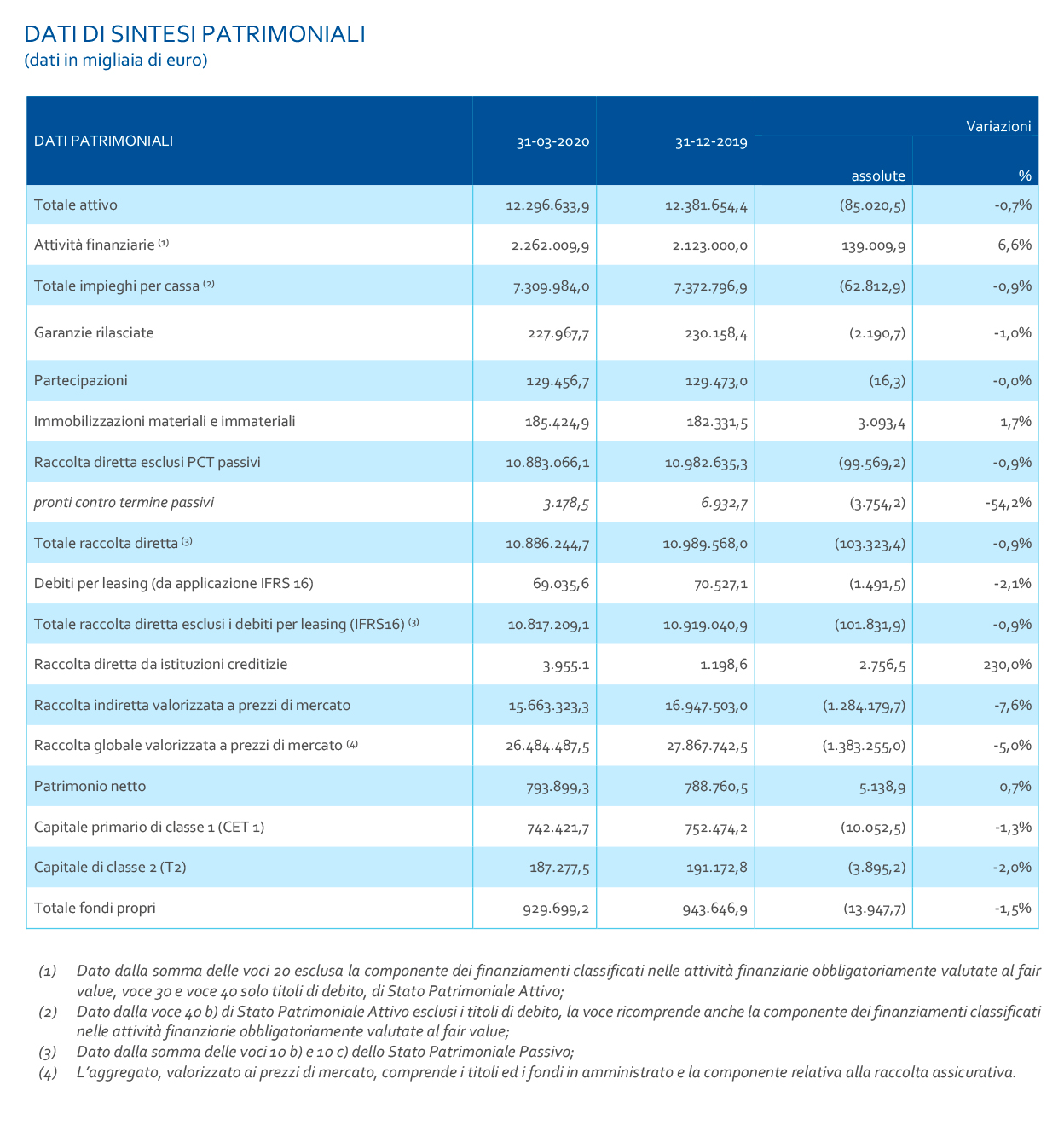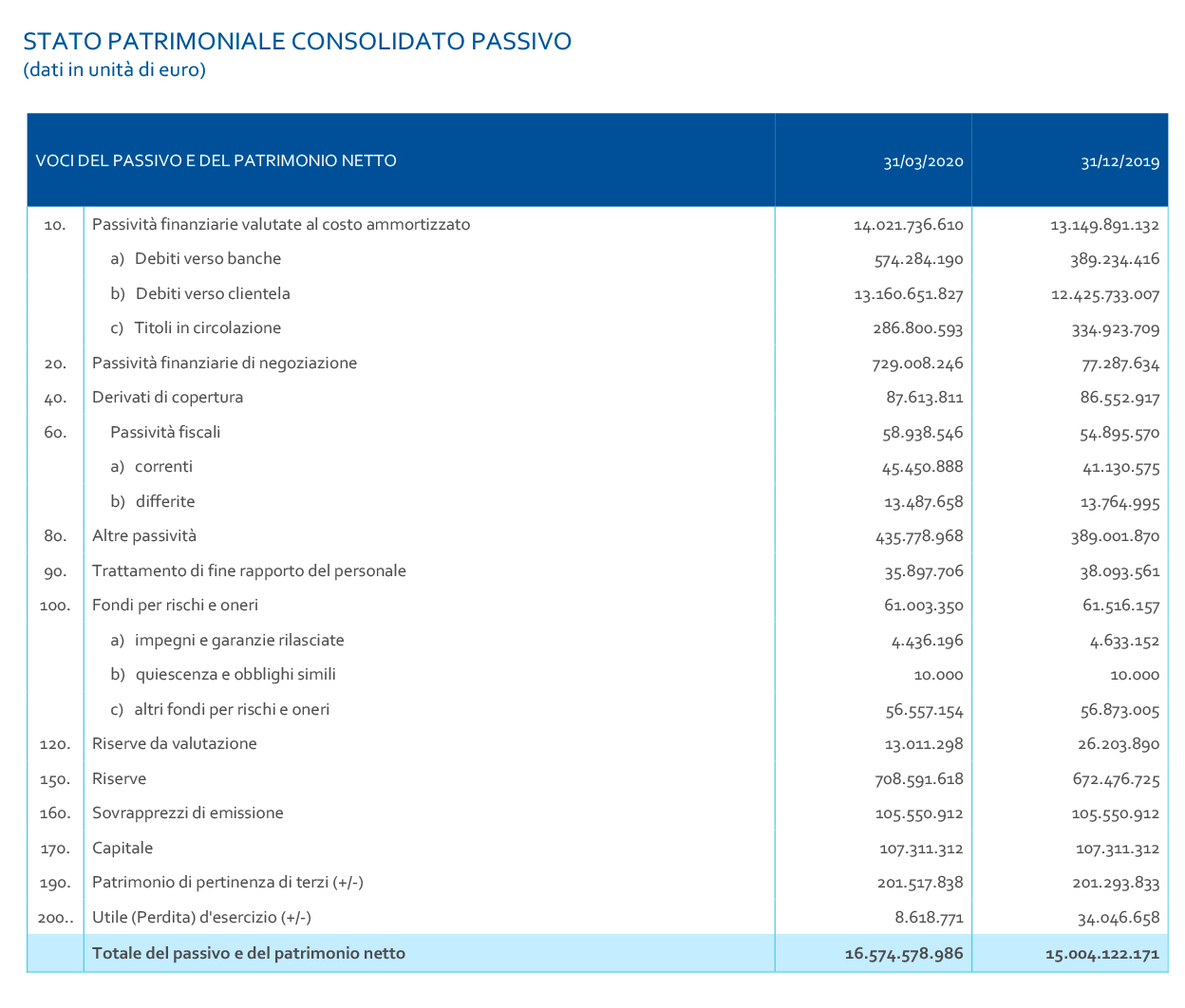 Gli impieghi, comprensivi dei Pct, sono cresciuti del 7,2% a 9 miliardi di euro, mentre gli impieghi al netto dei Pct sono sostanzialmente stabili a 8,3 miliardi di euro (-0,2%). Il costo del rischio di credito nel trimestre è stato pari a 0,74%. I dati della trimestrale, però, incorporano solo parzialmente gli effetti del lockdown causato dall'emergenza Covid-19 ed è quindi prevedibile che nel corso dell'anno tale costo subirà un incremento per attestarsi a fine anno intorno ad un livello pari o marginalmente superiore all'1%. Tale stima è stata effettuata con riferimento alle previsioni macroeconomiche e settoriali di consensus ad oggi, e non potrà che essere affinata e ricalcolata in base all'effettivo scenario economico dei prossimi mesi. In crescita i ricavi netti (+15,1% a 94 milioni di euro) e il margine di intermediazione (+7,9% a 151,9 milioni di euro), mentre è diminuito il margine di interesse (-2,1 % a 57,9 milioni di euro).