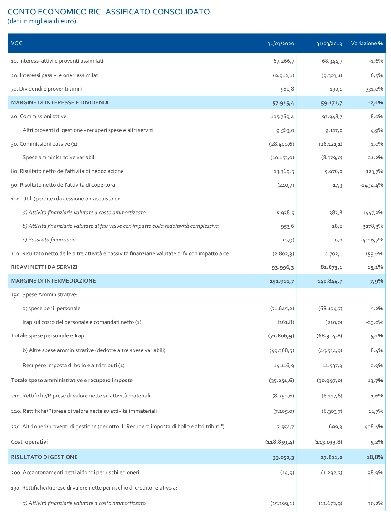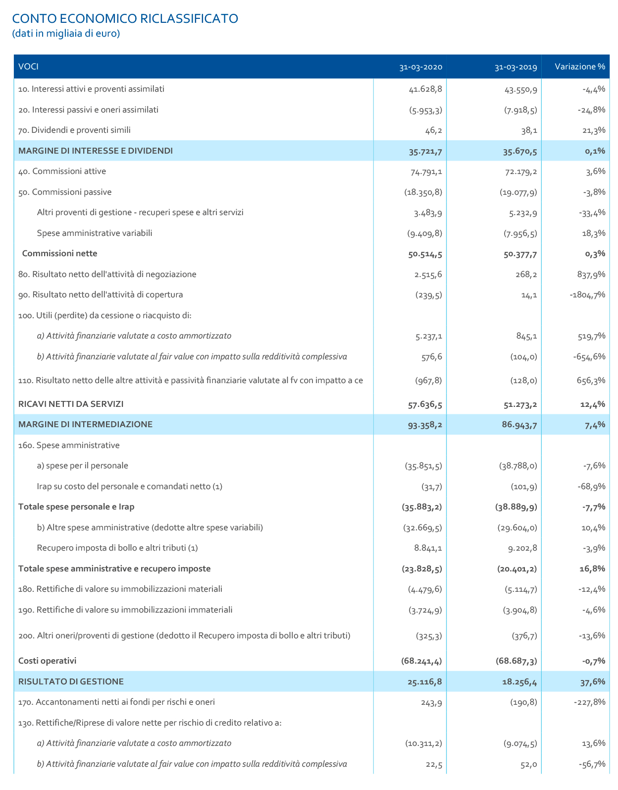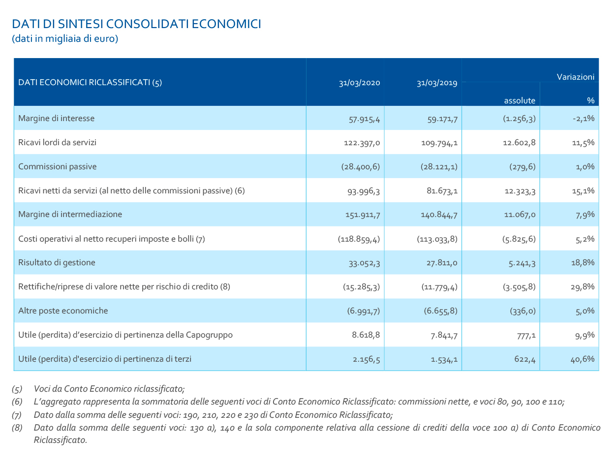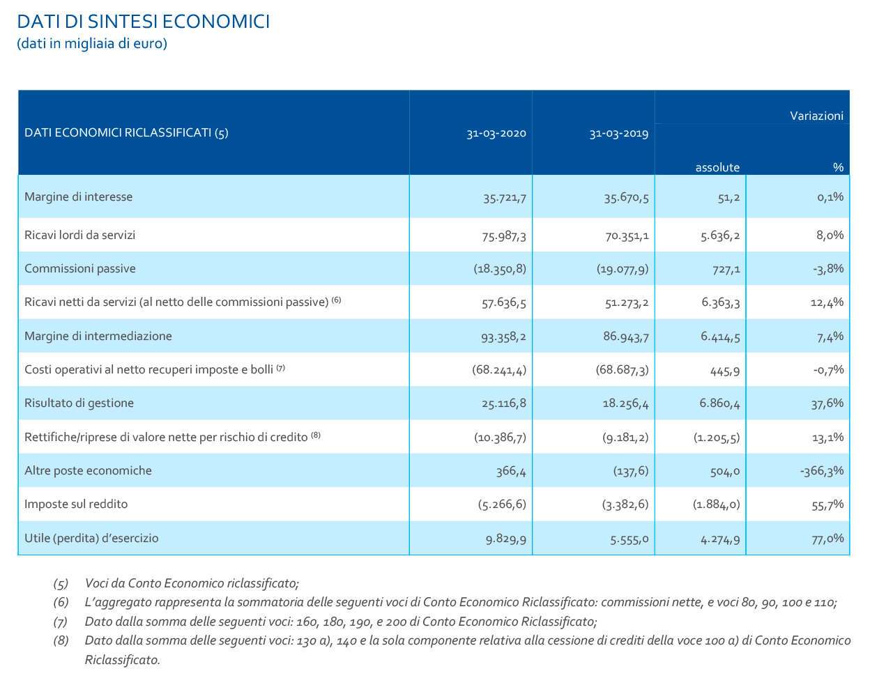 Il margine di interesse è stabile a 35,7 milioni di euro (+0,1%) e il margine di intermediazione è salito a 93,4 milioni (+7,4%). I ricavi netti da servizi sono aumentati a 57,6 milioni di euro (+12,4%). Questo risultato, pur in presenza degli effetti negativi del lockdown su alcune delle principali voci, come ad esempio le commissioni sui pagamenti, testimonia l'ottima diversificazione delle fonti di ricavo e l'efficacia delle soluzioni digitali che hanno consentito di continuare ad operare ed offrire la totalità dei servizi alla clientela.