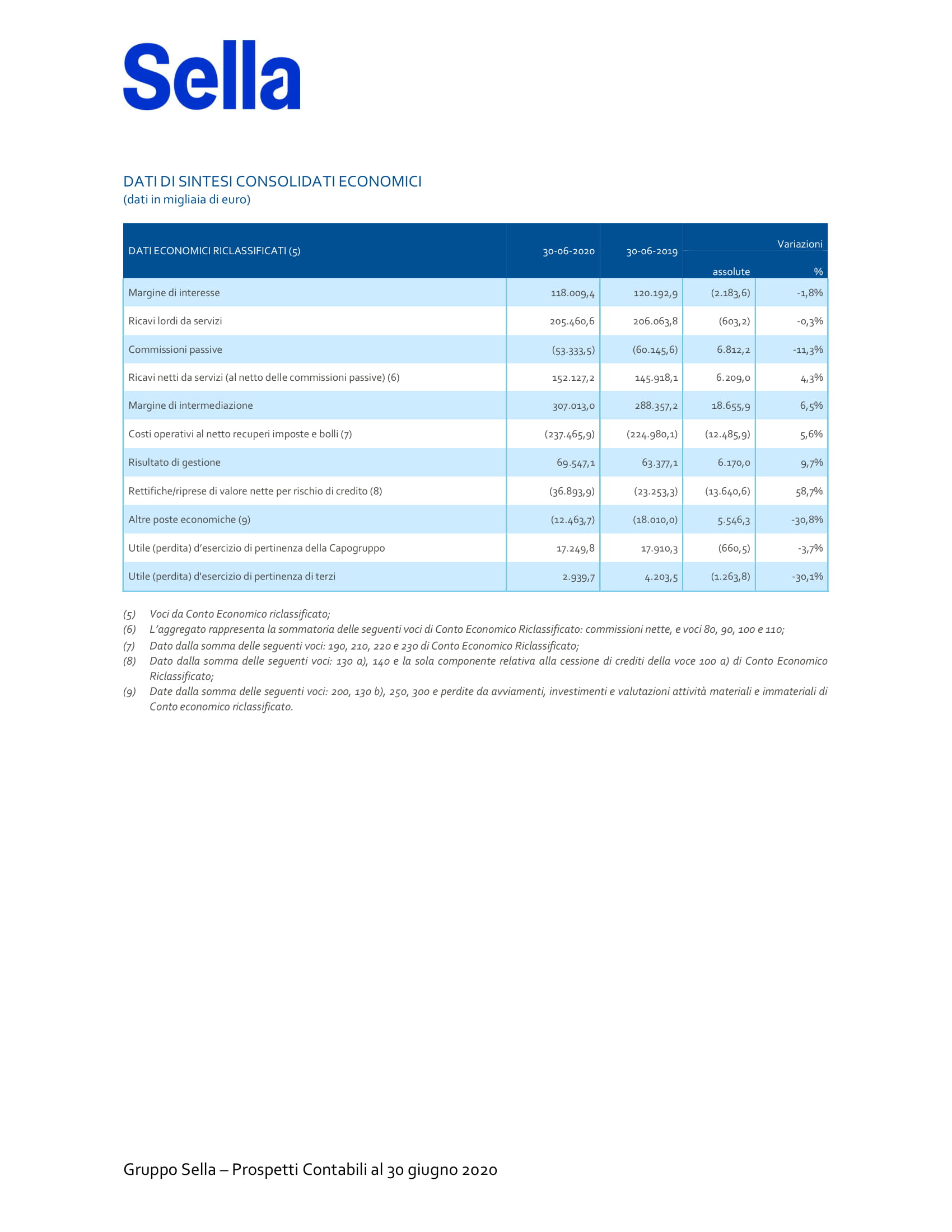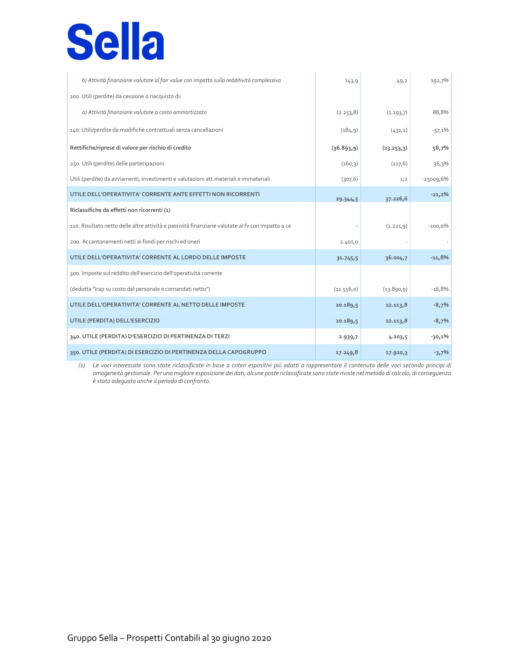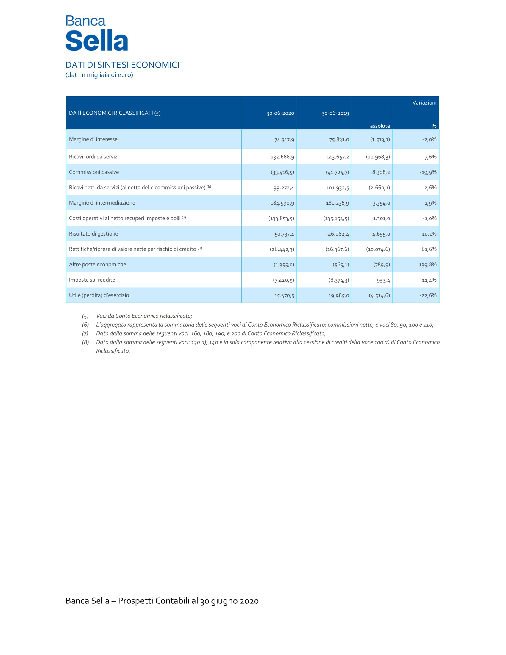 Per quanto riguarda Banca Sella, i risultati al 30 giugno 2020, approvati dal Consiglio d'Amministrazione, si sono chiusi con un utile netto di 15,5 milioni di euro. Le maggiori rettifiche prudenziali per il rischio di credito, pari a 11 milioni di euro, per possibili ulteriori impatti futuri legati allo scenario macroeconomico generale determinato dal Covid-19 sono in gran parte responsabili del calo rispetto ai 20 milioni di euro dello stesso periodo dell'anno precedente.