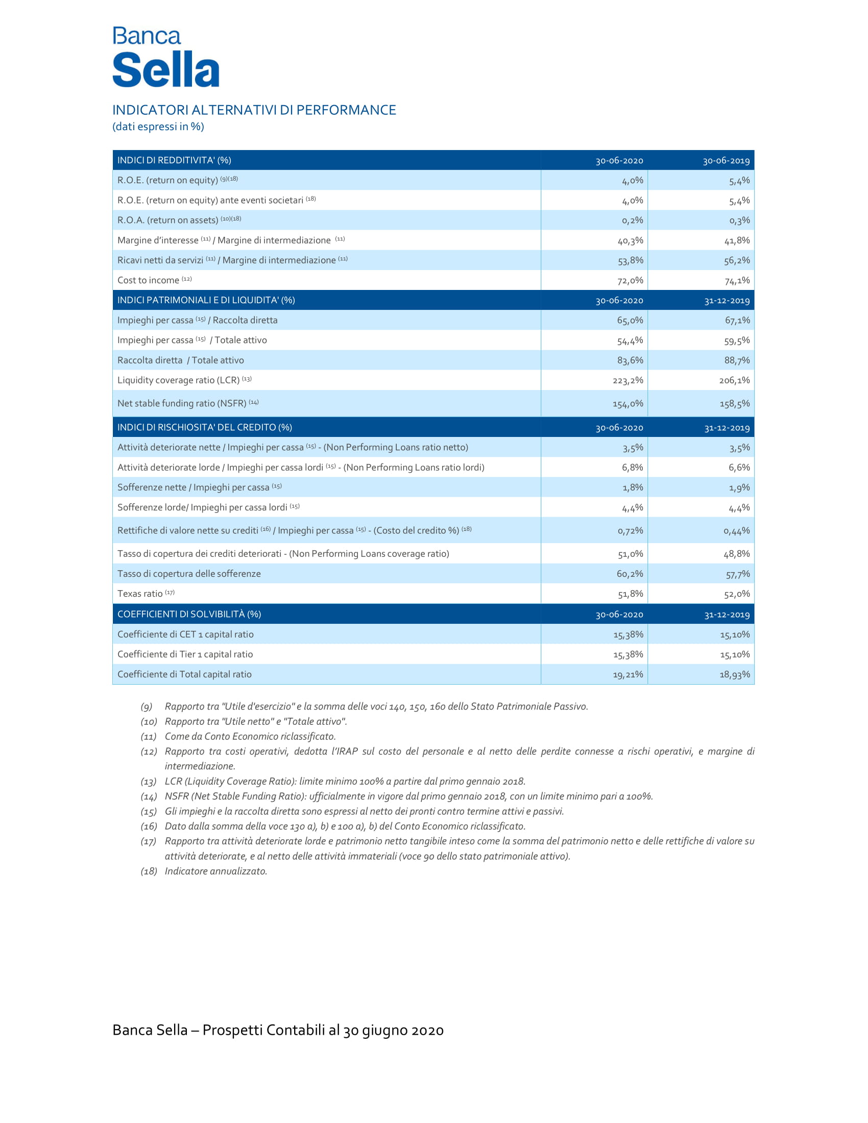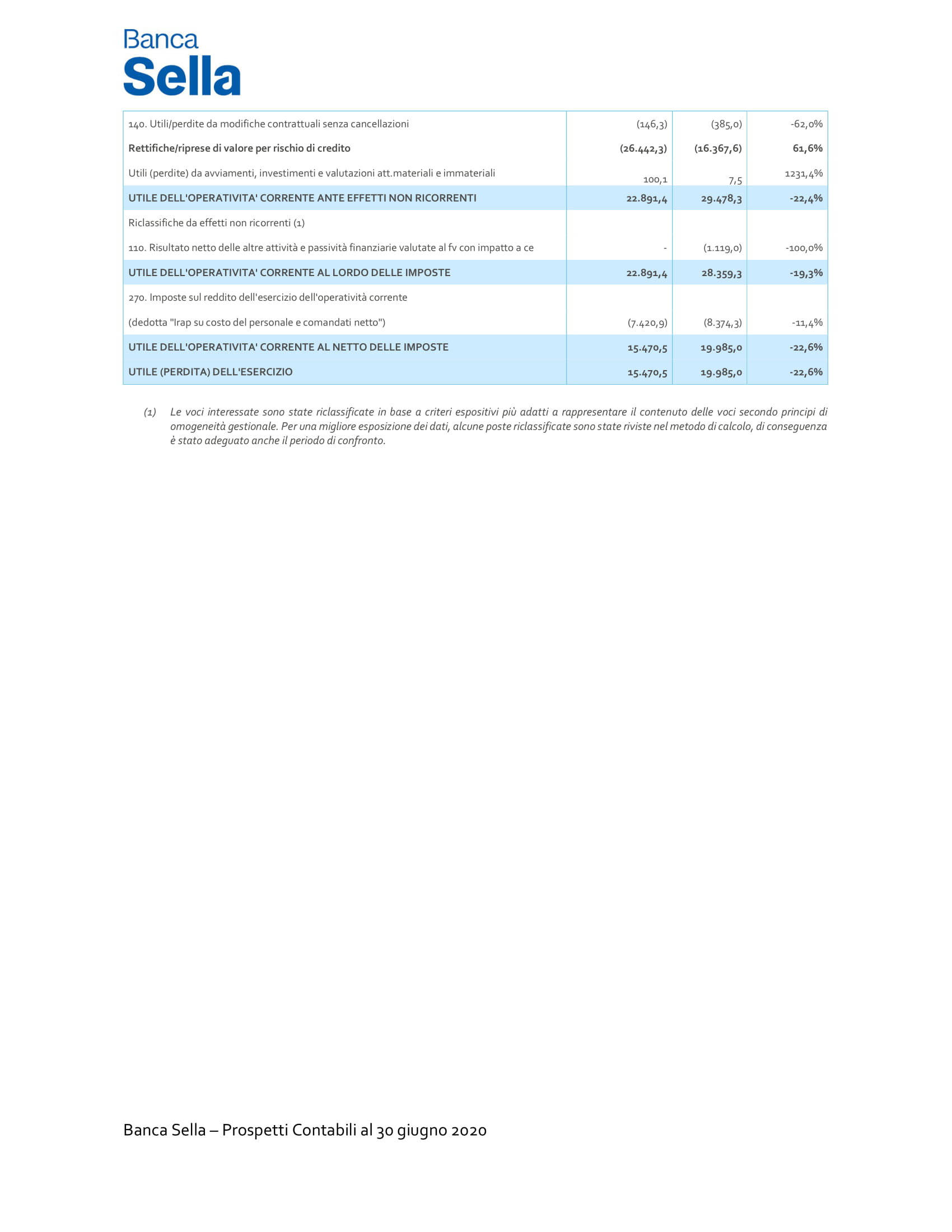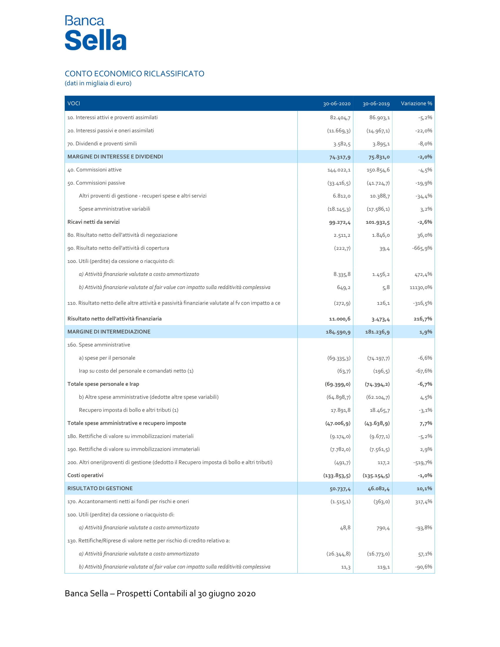 Per quanto riguarda Banca Sella, i risultati al 30 giugno 2020, approvati dal Consiglio d'Amministrazione, si sono chiusi con un utile netto di 15,5 milioni di euro. Le maggiori rettifiche prudenziali per il rischio di credito, pari a 11 milioni di euro, per possibili ulteriori impatti futuri legati allo scenario macroeconomico generale determinato dal Covid-19 sono in gran parte responsabili del calo rispetto ai 20 milioni di euro dello stesso periodo dell'anno precedente.