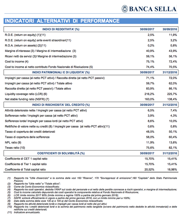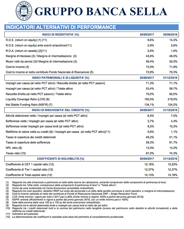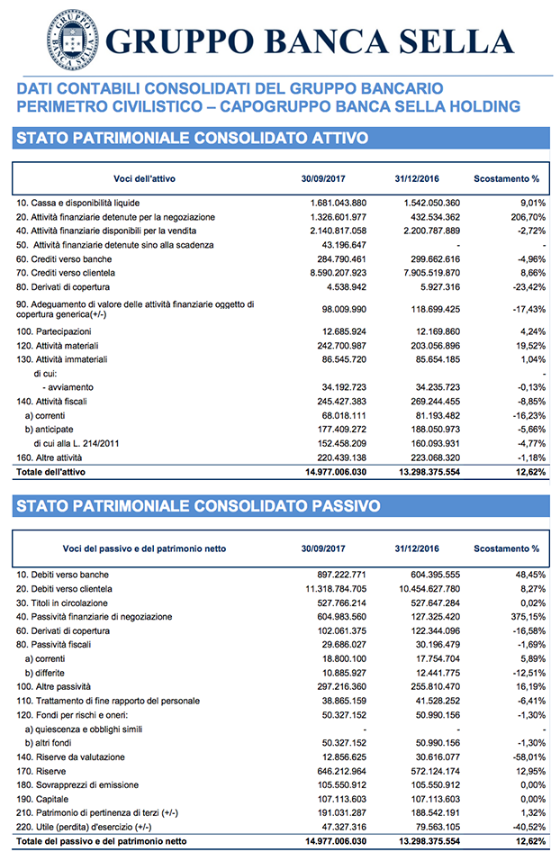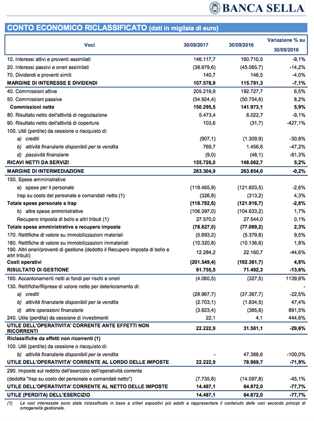 Bilancio positivo per il gruppo Sella, che ha chiuso i primi nove mesi del 2017 con un utile netto consolidato di 47,3 milioni di euro, la conferma dell'elevata solidità patrimoniale, l'aumento della raccolta e degli impieghi e l'ulteriore miglioramento della qualità del credito. Il risultato netto ottenuto senza considerare le componenti straordinarie, tra cui la cessione della partecipazione in Compagnie Financière Martin Maurel con impatto positivo e le svalutazioni delle contribuzioni e degli impegni al Fondo Atlante e allo Schema volontario del Fondo interbancario di tutela dei depositi con impatto negativo, sarebbe stato di 28,4 milioni di euro, in crescita rispetto ai 22,6 milioni di euro dello stesso periodo dell'anno precedente al netto delle componenti non ricorrenti. Il risultato era stato di 87,6 milioni di euro per effetto dell'acquisizione di Visa Europe, di cui Banca Sella era azionista, da parte di Visa Inc, di cui Banca Sella è ora azionista, e della cessione della compagnia Cba Vita ad Hdi Assicurazioni.