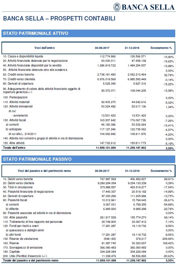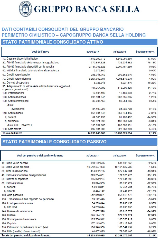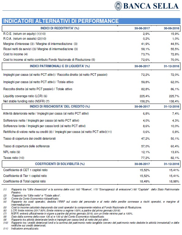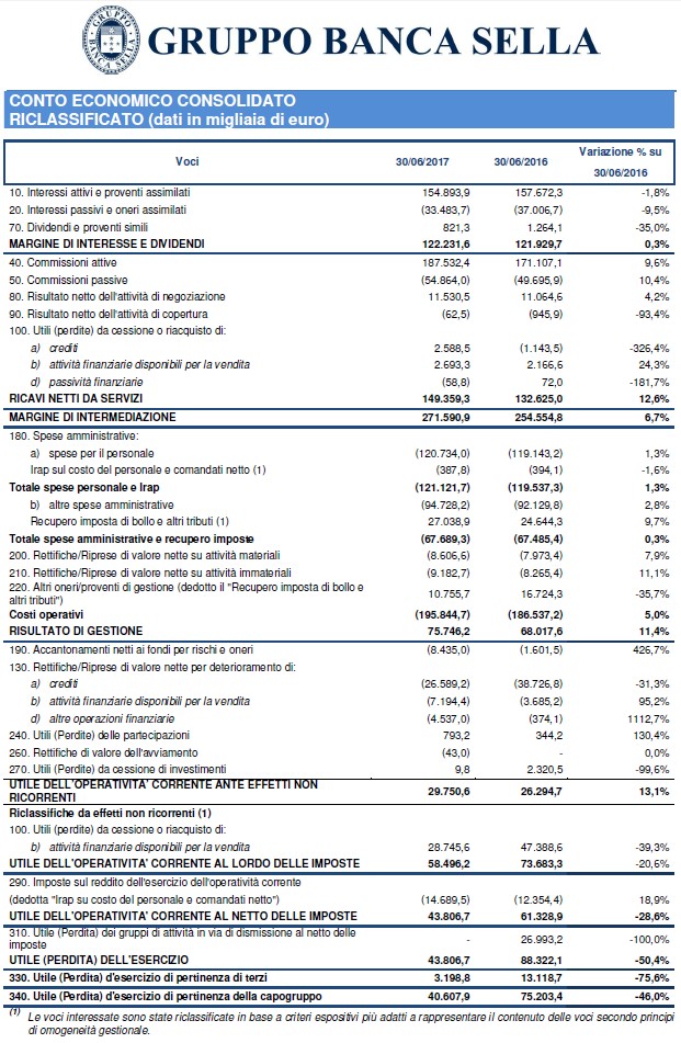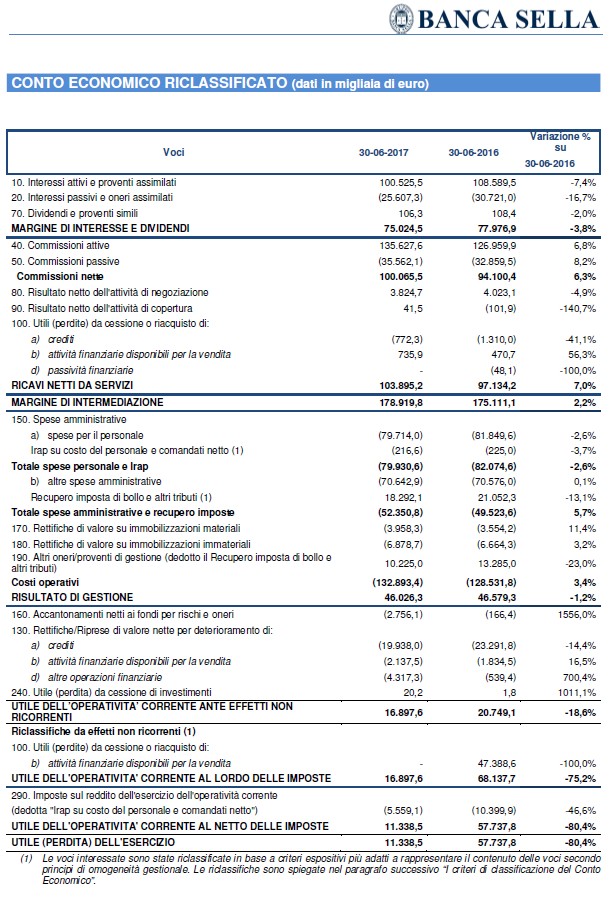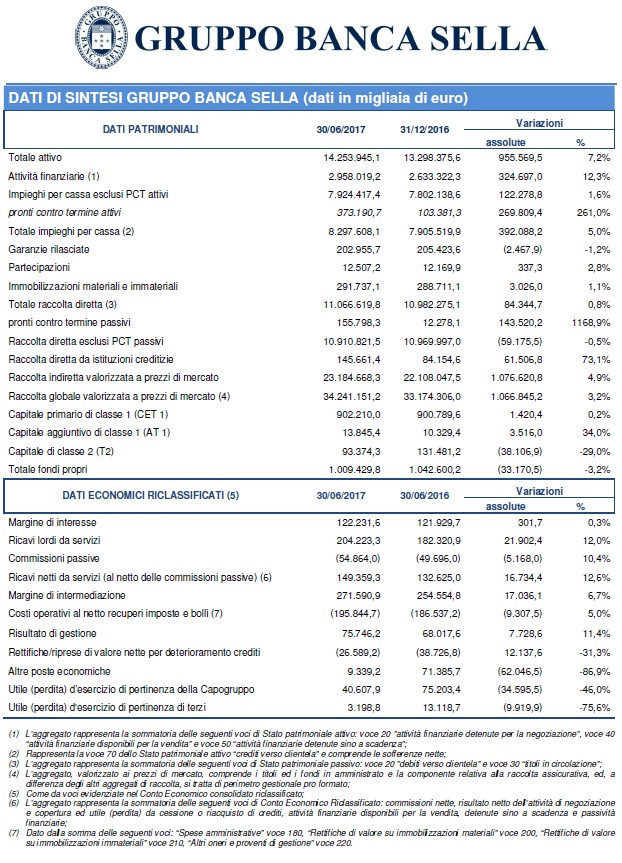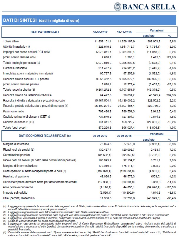 Sul risultato del primo semestre hanno inciso alcune componenti straordinarie tra cui, con impatto positivo la cessione della partecipazione in Compagnie Financière Martin Maurel e con impatto negativo le svalutazioni delle contribuzioni e degli impegni al Fondo Atlante e allo Schema volontario del Fondo interbancario di tutela dei depositi, senza considerare le quali l'utile netto sarebbe stato pari a 21,7 milioni di euro, in crescita rispetto ai 13,3 milioni di euro del primo semestre dell'anno precedente a perimetro confrontabile (considerando le componenti straordinarie derivanti dall'acquisizione di Visa Europe, di cui Banca Sella era azionista, da parte di Visa Inc, di cui Banca Sella è ora azionista, e dalla cessione della compagnia assicurativa Cba Vita ad Hdi Assicurazioni, l'utile netto del primo semestre 2016 era stato pari a 75,2 milioni di euro).