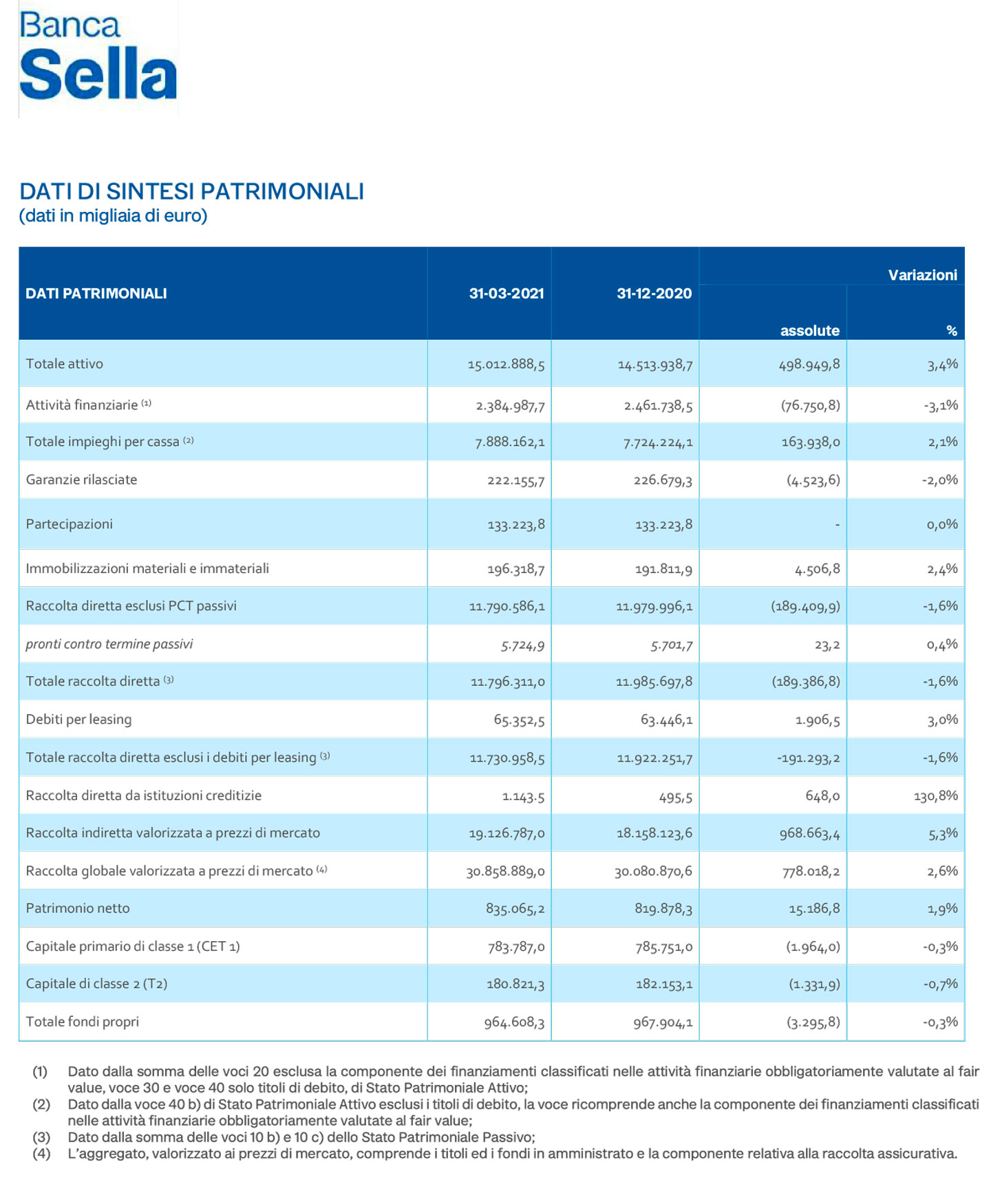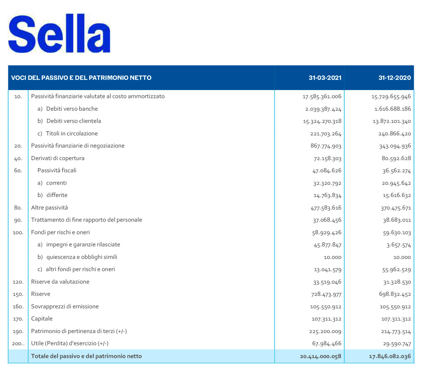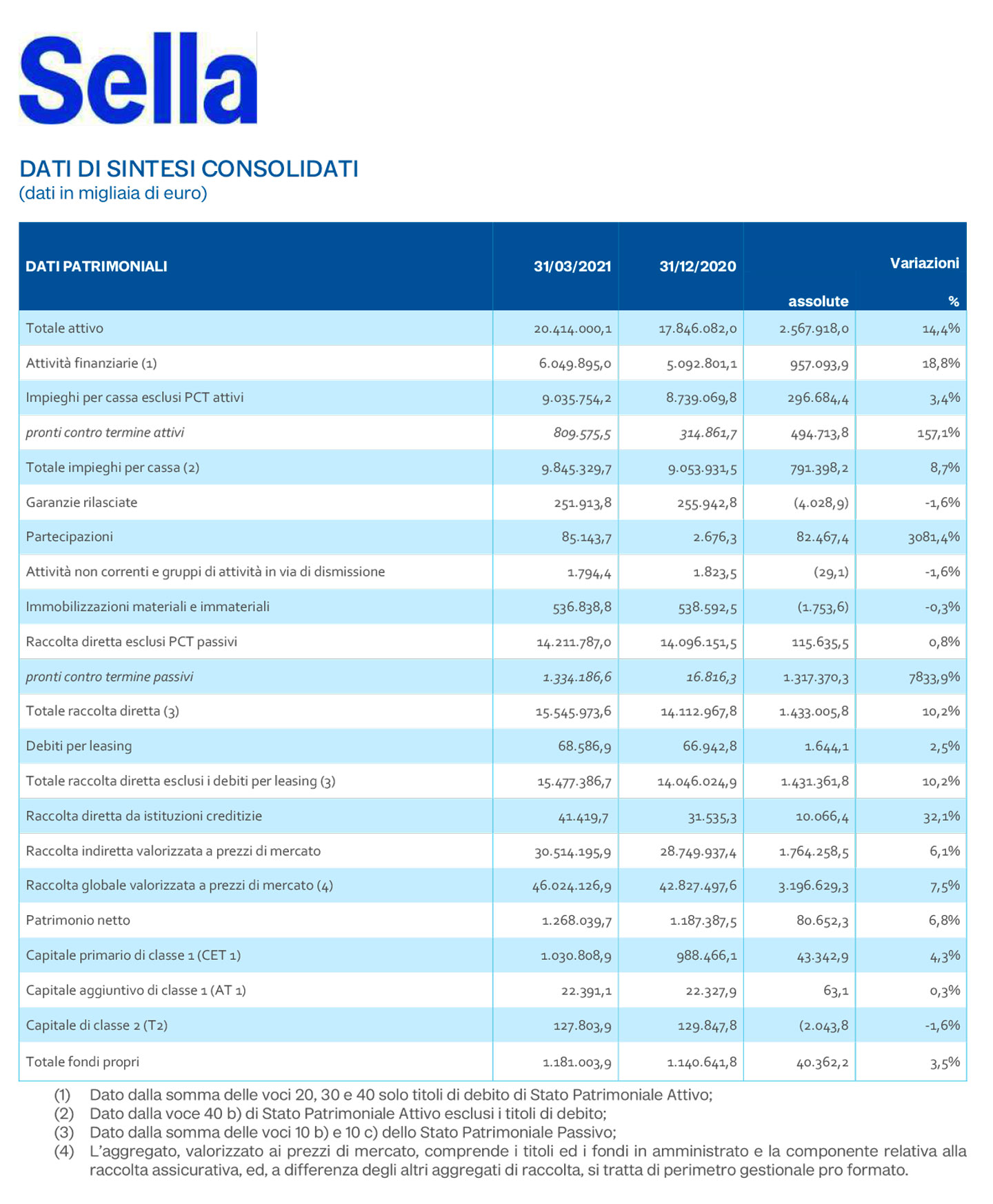 Banca Sella e il gruppo Sella hanno chiuso il primo trimestre dell'anno con risultati positivi, confermando il supporto ai clienti nello scenario complesso della pandemia. I risultati al 31 marzo 2021, approvati oggi dai Consigli di amministrazione di Banca Sella e della capogruppo Banca Sella Holding, infatti, hanno evidenziato la crescita dell'utile netto, il buon andamento della raccolta e degli impieghi e la conferma dell'elevata solidità patrimoniale.