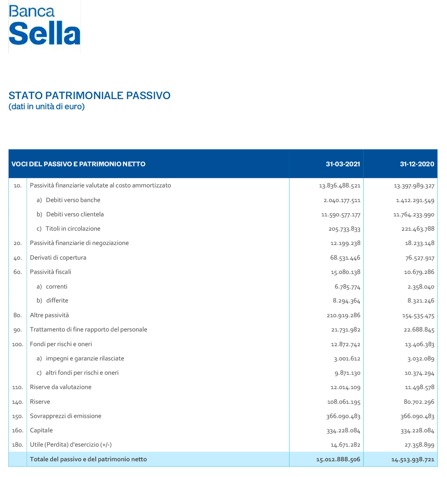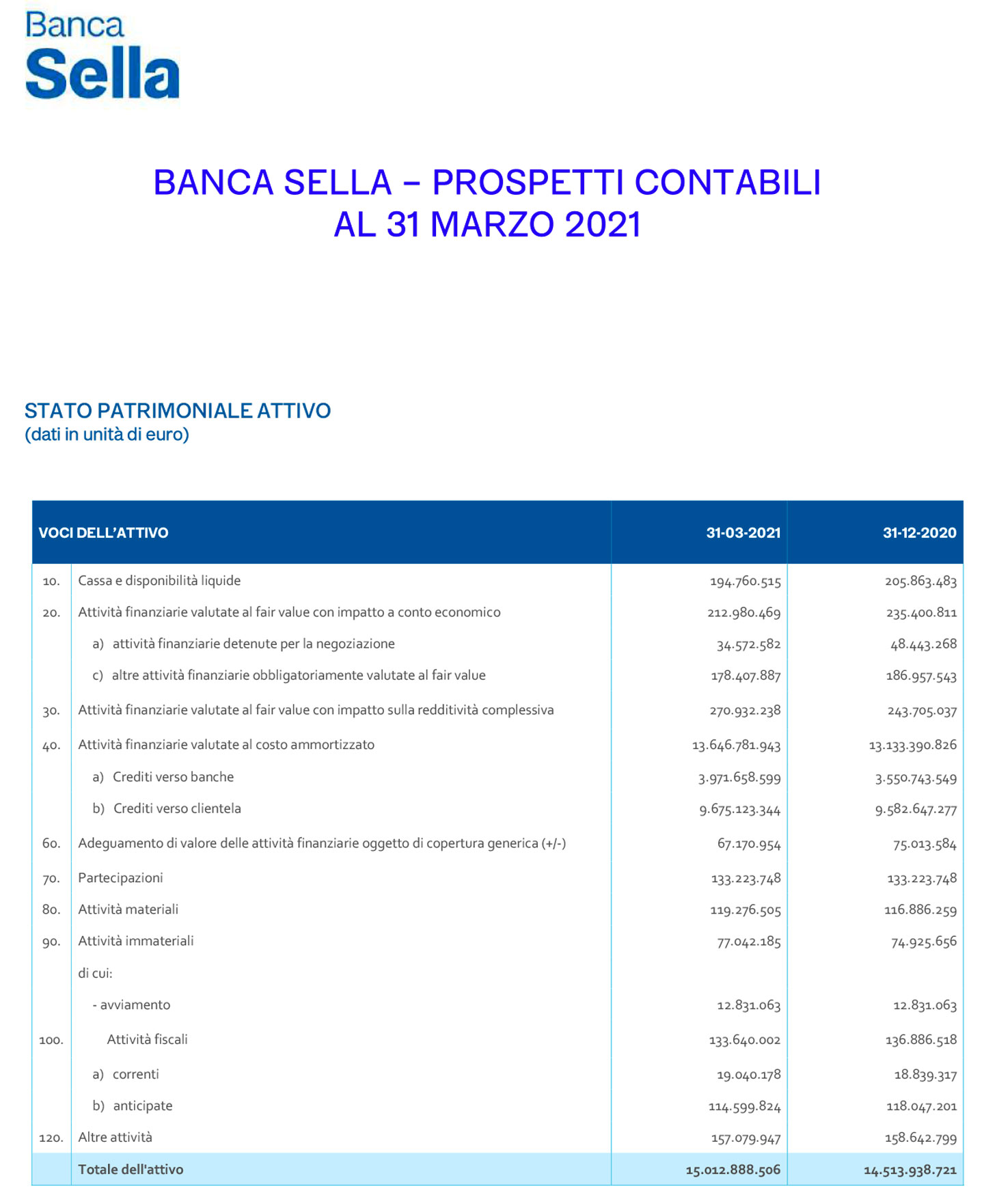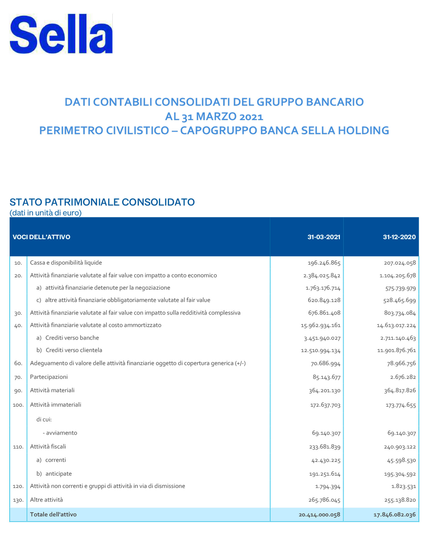 Banca Sella e il gruppo Sella hanno chiuso il primo trimestre dell'anno con risultati positivi, confermando il supporto ai clienti nello scenario complesso della pandemia. I risultati al 31 marzo 2021, approvati oggi dai Consigli di amministrazione di Banca Sella e della capogruppo Banca Sella Holding, infatti, hanno evidenziato la crescita dell'utile netto, il buon andamento della raccolta e degli impieghi e la conferma dell'elevata solidità patrimoniale.