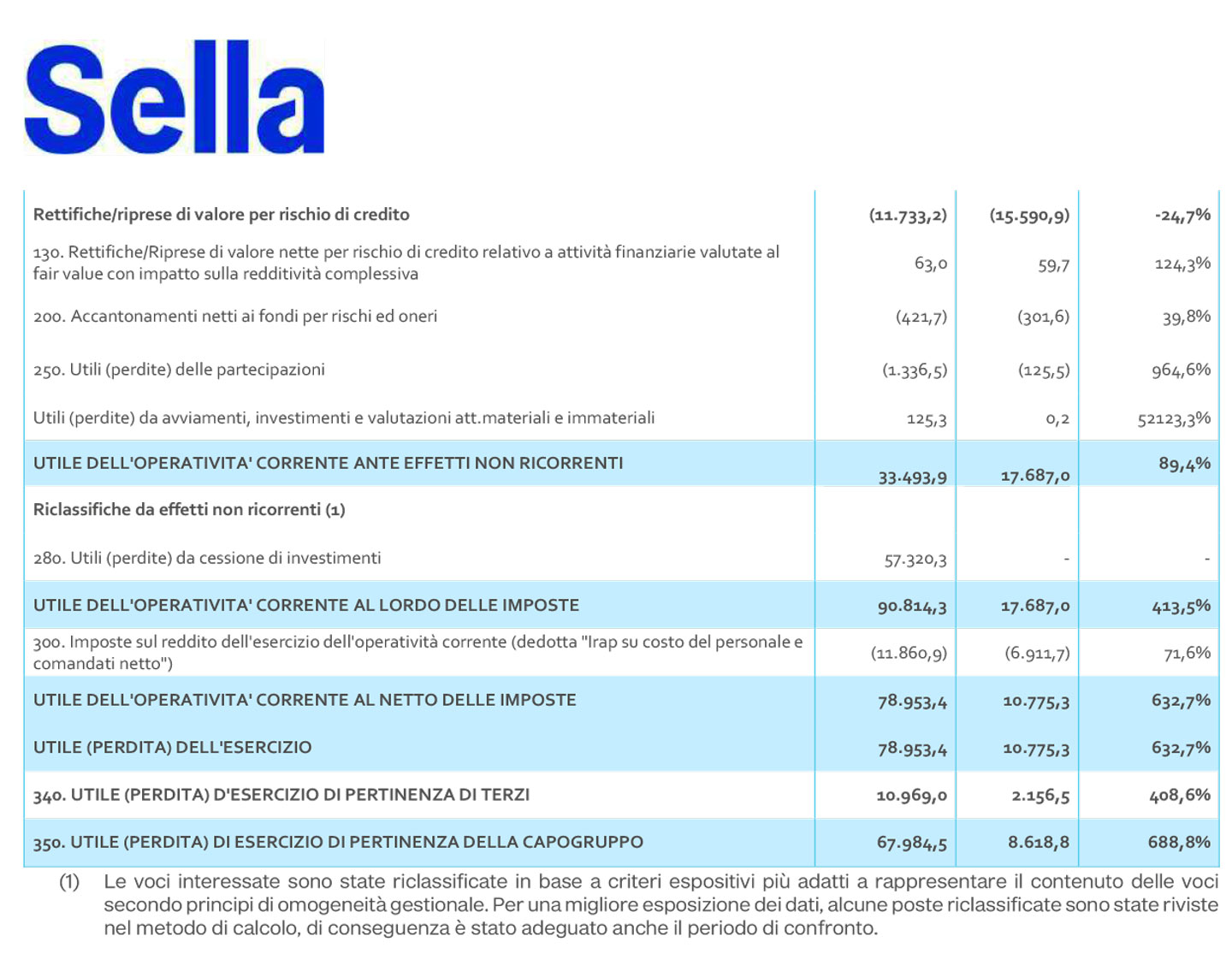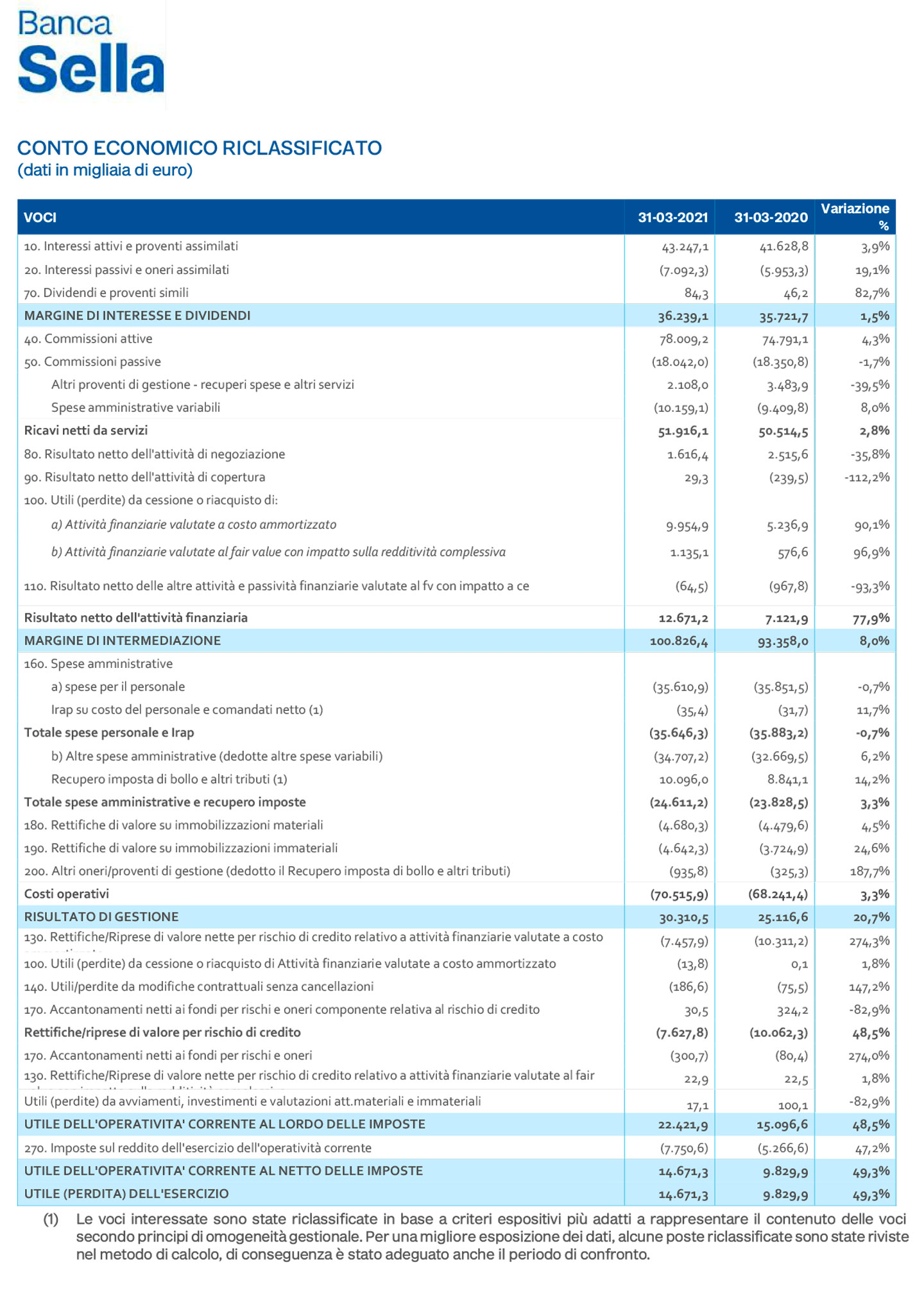 Banca Sella ha chiuso il primo trimestre dell'anno con un utile netto di 14,7 milioni di euro, in crescita rispetto ai 9,8 milioni di euro dello stesso periodo dell'anno precedente, con il contributo positivo di tutti i settori e in particolare dei servizi d'investimento e dell'area finanza. A conferma della fiducia da parte dei clienti, la raccolta globale al valore di mercato si è attestata a 30,9 miliardi di euro, con una crescita del 2,6% rispetto allo stesso periodo dello scorso anno. La raccolta diretta si è attestata a 11,8 miliardi di euro, in calo dell'1,6%. La raccolta netta è stata di 452 milioni di euro.
