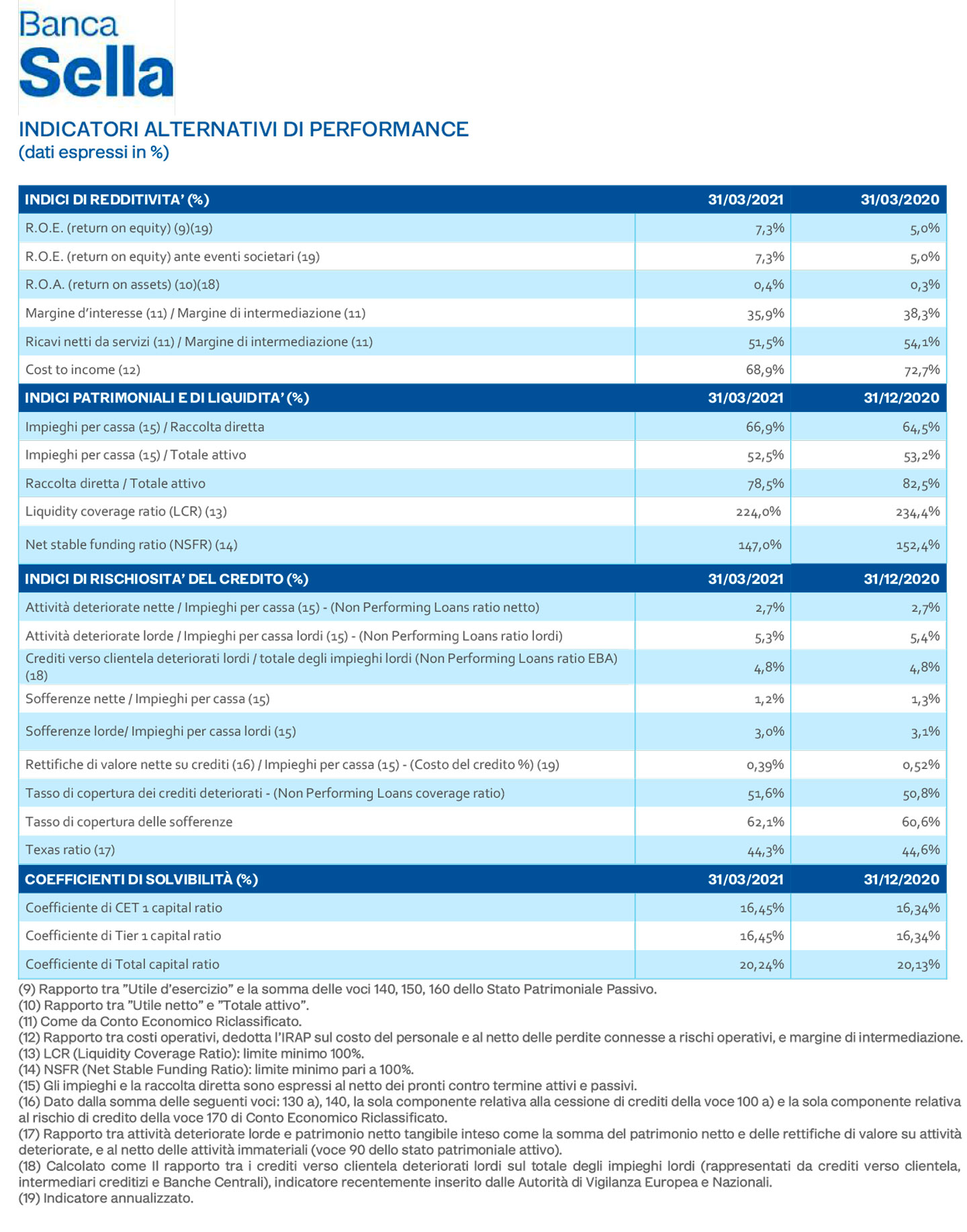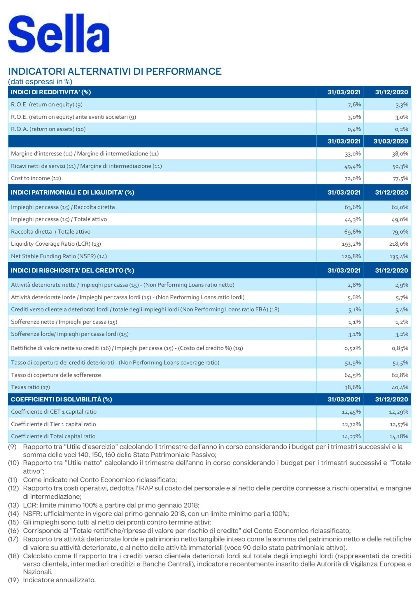 Quanto agli indici di qualità del credito, l'Npl Ratio netto è rimasto stabile rispetto a fine 2020 al 2,7%. L'indice Texas Ratio della banca, che misura la capienza del patrimonio e degli accantonamenti rispetto ai rischi di credito, è migliorato scendendo al 44,3%, rispetto al 44,6% di fine 2020. Il costo del rischio di credito annualizzato al 31 marzo 2021 è stato pari a 39 bps. Tale costo era stato di 52 bps a fine 2020.