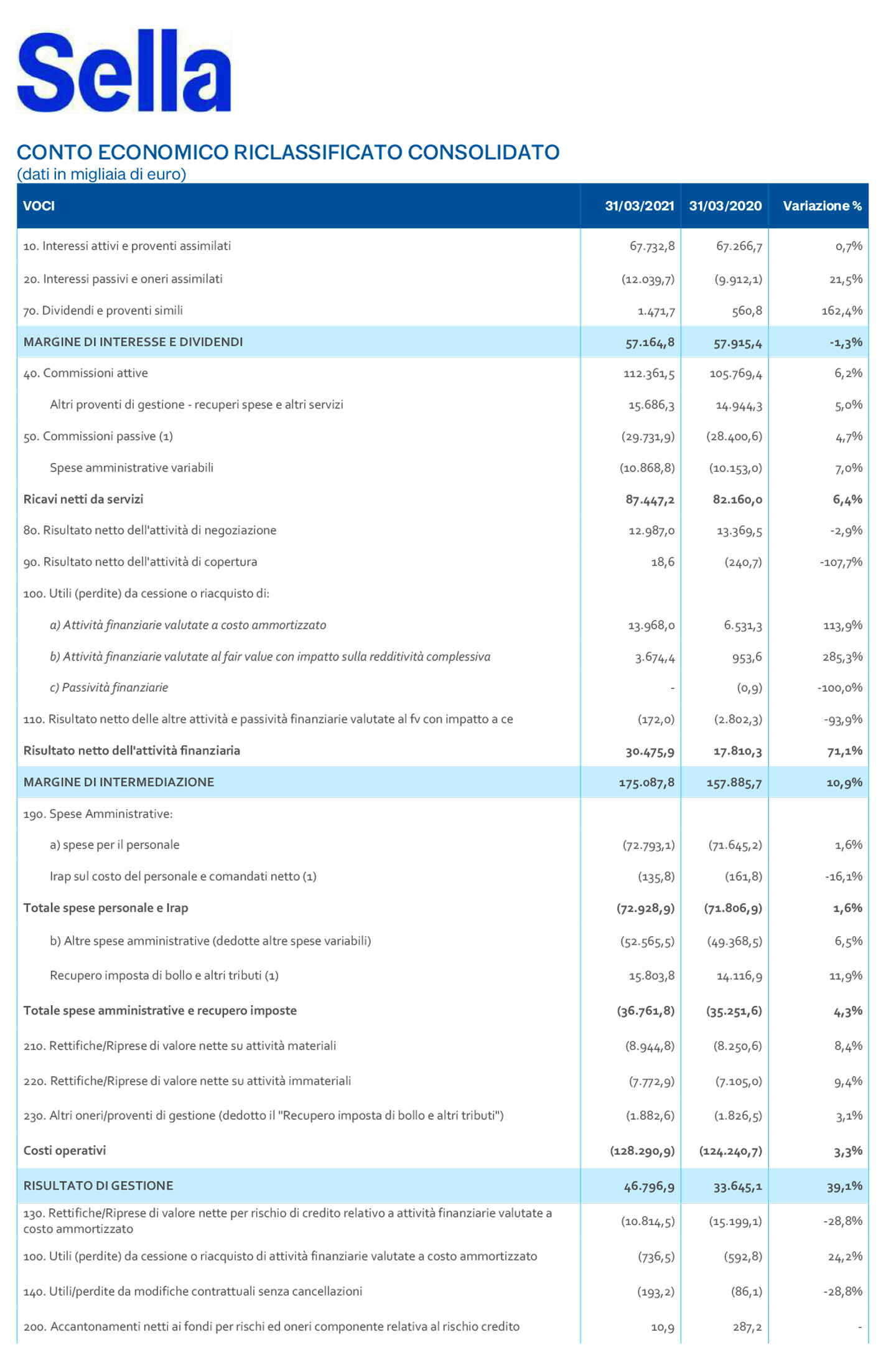 I risultati consolidati al 31 marzo 2021 del gruppo Sella si sono chiusi con un utile netto, senza considerare le componenti straordinarie, di 17,6 milioni di euro, in crescita rispetto agli 8,6 milioni di euro dello stesso periodo dell'anno precedente grazie al buon andamento di tutti i settori, tra cui i servizi di investimento, i sistemi di pagamento e l'investment banking. Considerando la plusvalenza derivante dalla cessione della partecipazione del 50% in Hype, perfezionata a gennaio 2021, l'utile netto è stato di 68 milioni di euro. La conseguente costituzione di una joint venture paritetica, strategica per far crescere ulteriormente Hype, che ha rappresentato la prima operazione di consolidamento industriale nel mercato italiano dell'open banking, ha portato all'acquisizione di una quota complessiva del 10% di illimity Bank da parte della capogruppo Banca Sella Holding e di Fabrick, la società del Gruppo per lo sviluppo dell'open banking e dell'ecosistema fintech in Italia.
