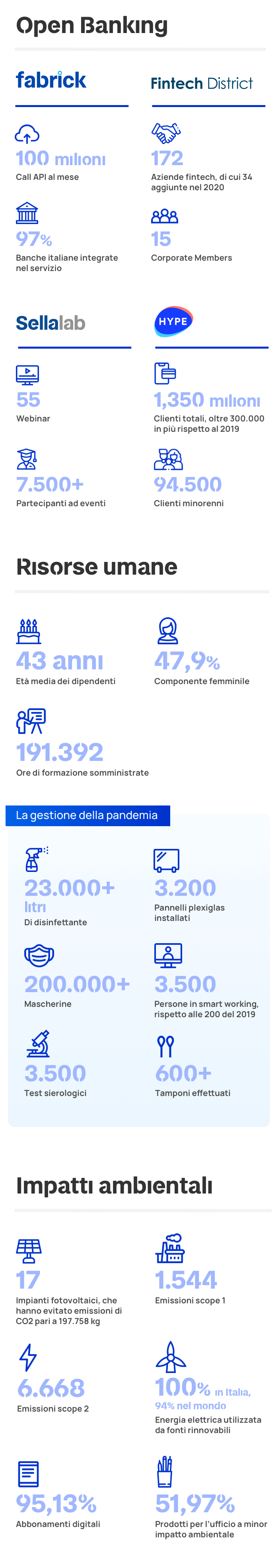 One of the timely measures adopted to protect the health of employees and customers also thanks to important investments in technology in recent years, was the use of smart working and remote relationships, in all cases implemented, "from evening to morning". Smart working involved over 3,500 people simultaneously. The total remote working days during the year went from 17,000 to 460,000. The new ways of working also involved a training campaign and a comprehensive program to equip employees with laptops, screens, keyboards, ergonomic chairs and other tools to improve personal workstations outside the office.