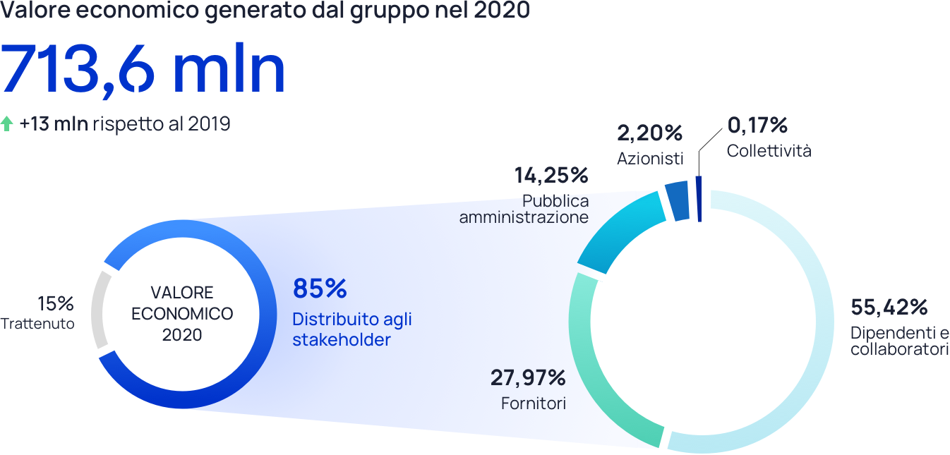 One of the main data resulting from the Non-Financial Declaration concerns the Economic Value, also defined as added value, created by the activities of the Group, which amounted to 713.6 million euros (13 million more than in 2019), 85% of which was distributed. Much of the shared economic value (55,4% circa 337.1 million euros) was used for employees and cooperators in the form of salaries, variable remuneration and social security contributions. 28% was used for the payment and support of the supply chain business system: overall the Group made purchases of over 170 million euros. Economic impacts of the Group are also measured in supporting public spending through the sharing of tax revenues (14.3%) and in the remuneration of the share capital (2,2%), thus fostering further investments. Concerning disbursements to the collectivity as previously said, the Group disbursed more than 1 million euros for the Coronavirus emergency and in form of contributions to entities and associations (Fondazione Sella, Fondazione Umberto Veronesi), Universities, non-profit organizations, the Italian Red Cross.