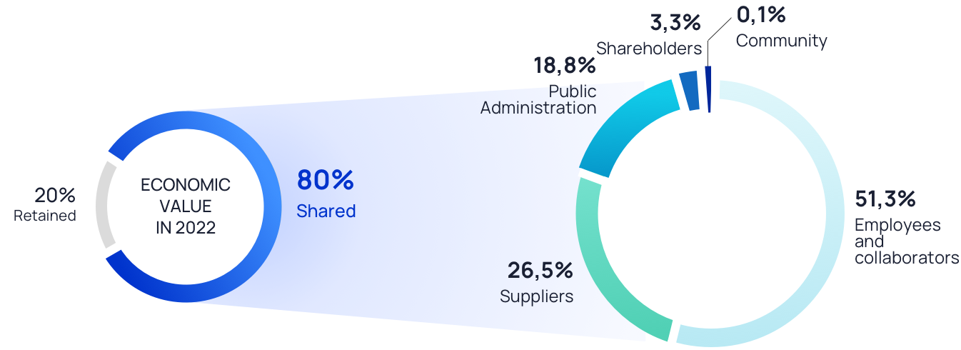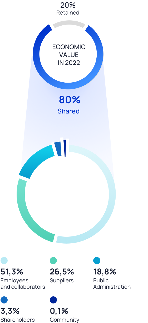 The Economic Value generated by the Group in 2022 amounted to 1.005 million euro (up by 109 million euro against 2021) 80% of which was distributed, worth a shared value of 807,6 million euro, up by about 118,3 million euro against the previous year. Much of the shared economic value (51,3 %) was used for employees and collaborators in the form of salaries, variable remuneration and social security contributions (about 414 million euro), 26,5 % was used for the payment and support of the supply chain business system: overall the Group made purchases for over 214 million euro. Economic impacts of the Group are also measured in supporting public spending through the sharing of tax revenues (18,8 %) and in the remuneration of the share capital (3,3 %), thus fostering further investments. In 2022 as it was previously stated, the Group disbursed around 1 million euro as contributions to organizations and associations, in particular to foundations the Sella Foundation and the Umberto Veronesi Foundation), as well as to universities, non-profit organizations, Unicef, the Italian Red Cross and the Ca Sella corporate Recreational Club of the employees.