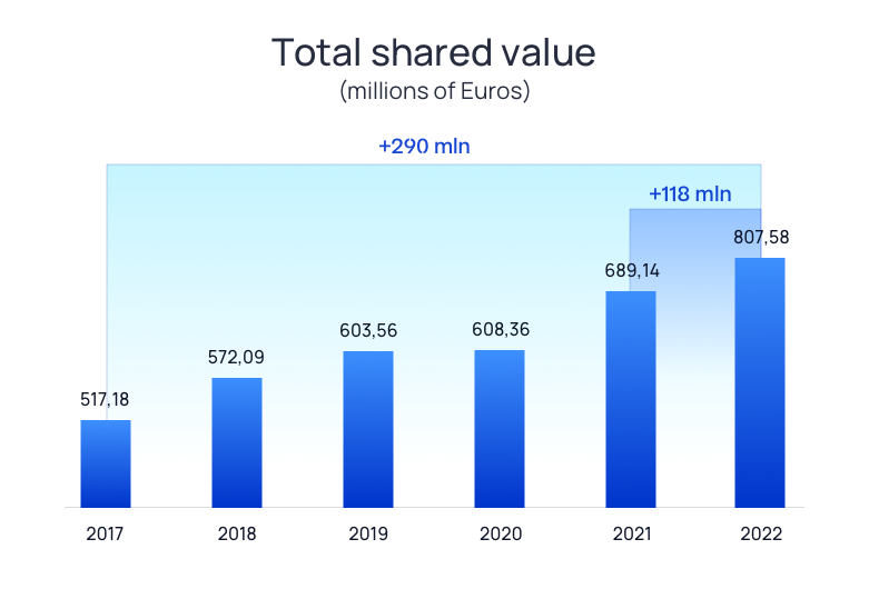 Over the past 6 years, the Group has steadily increased the amount of distributed value, recording an increase between 2017 and 2022 of over 290 million euro.