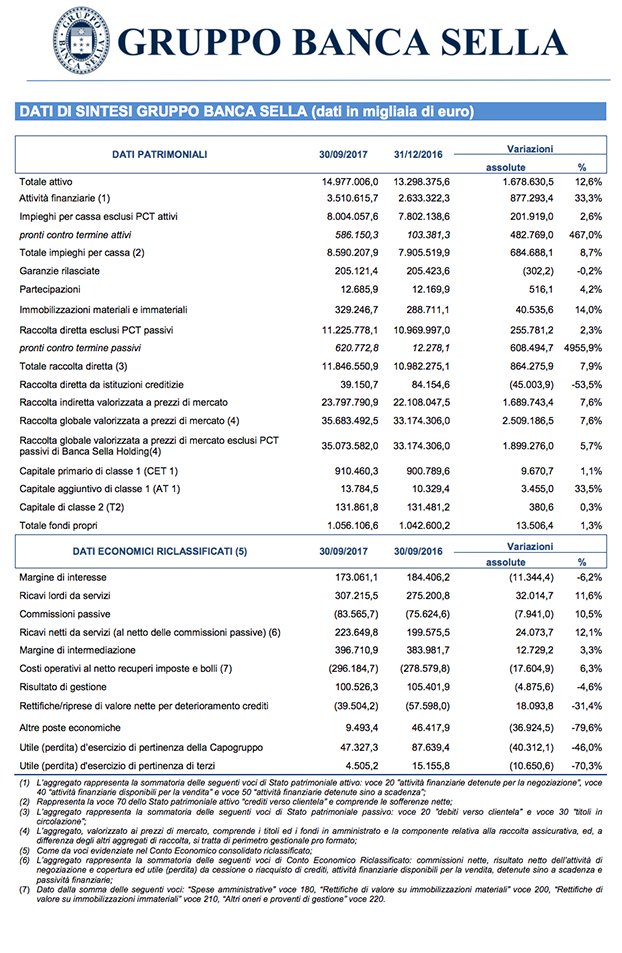 Bilancio positivo per il gruppo Sella, che ha chiuso i primi nove mesi del 2017 con un utile netto consolidato di 47,3 milioni di euro, la conferma dell'elevata solidità patrimoniale, l'aumento della raccolta e degli impieghi e l'ulteriore miglioramento della qualità del credito. Il risultato netto ottenuto senza considerare le componenti straordinarie, tra cui la cessione della partecipazione in Compagnie Financière Martin Maurel con impatto positivo e le svalutazioni delle contribuzioni e degli impegni al Fondo Atlante e allo Schema volontario del Fondo interbancario di tutela dei depositi con impatto negativo, sarebbe stato di 28,4 milioni di euro, in crescita rispetto ai 22,6 milioni di euro dello stesso periodo dell'anno precedente al netto delle componenti non ricorrenti. Il risultato era stato di 87,6 milioni di euro per effetto dell'acquisizione di Visa Europe, di cui Banca Sella era azionista, da parte di Visa Inc, di cui Banca Sella è ora azionista, e della cessione della compagnia Cba Vita ad Hdi Assicurazioni.