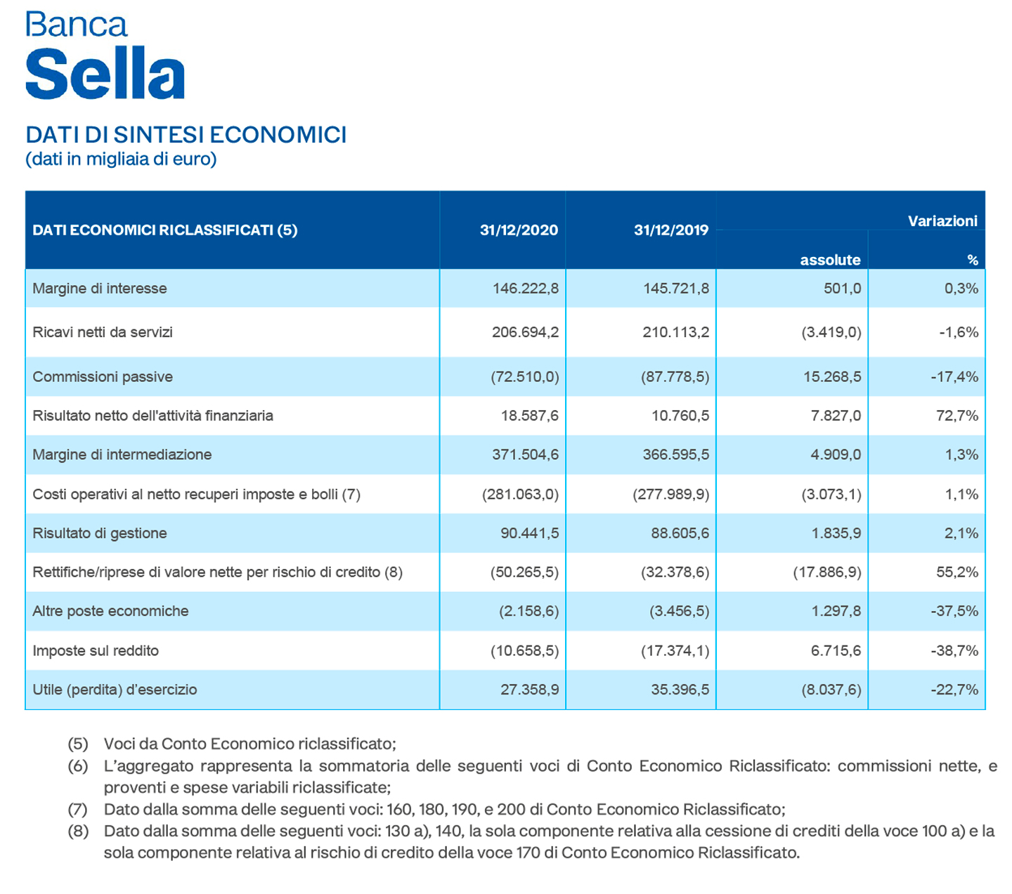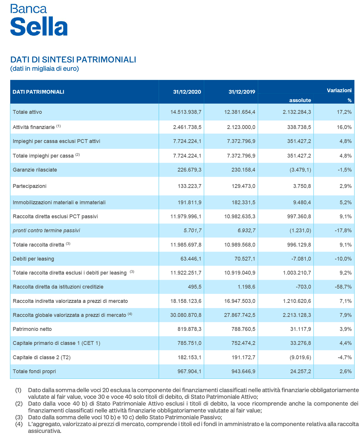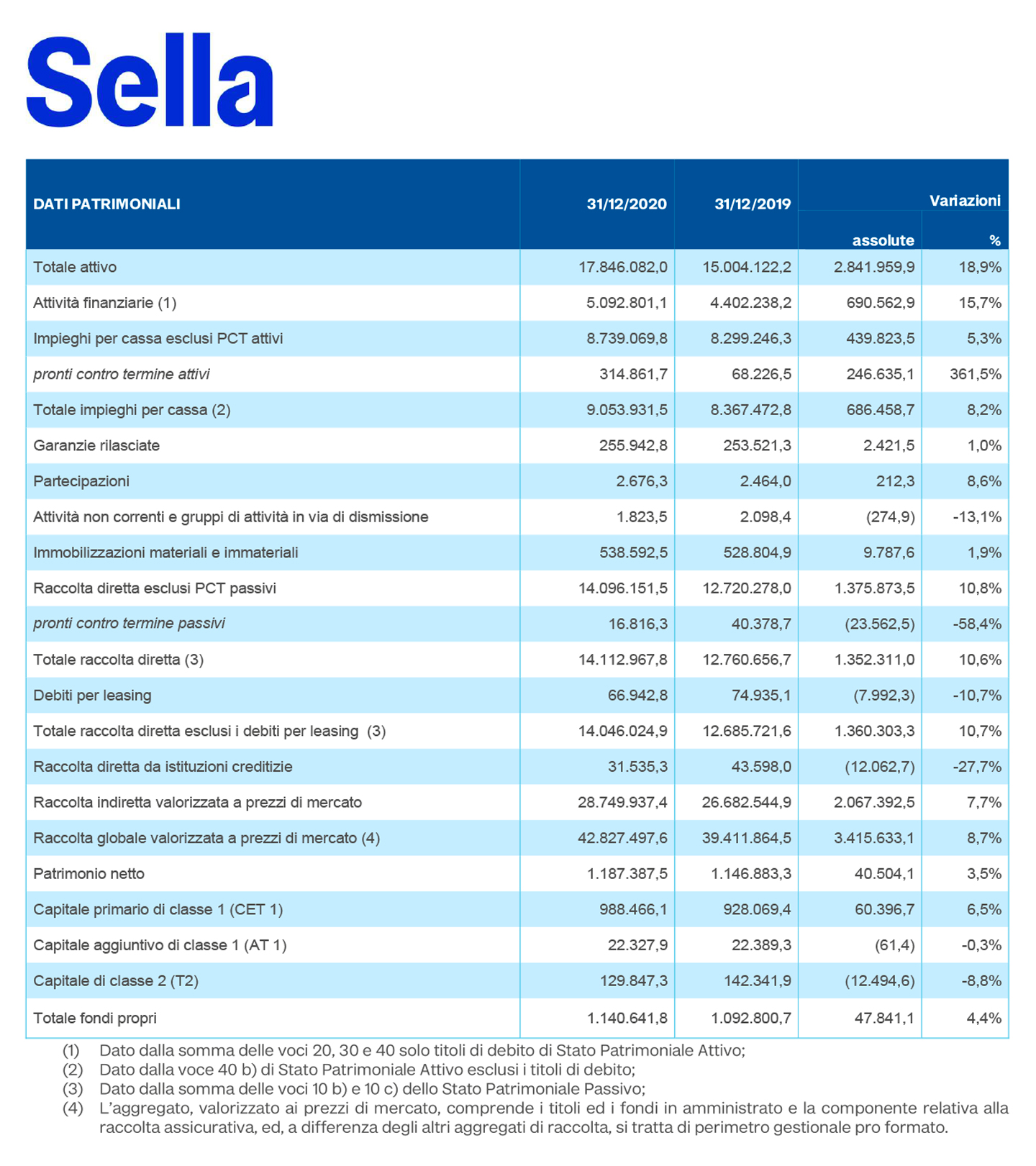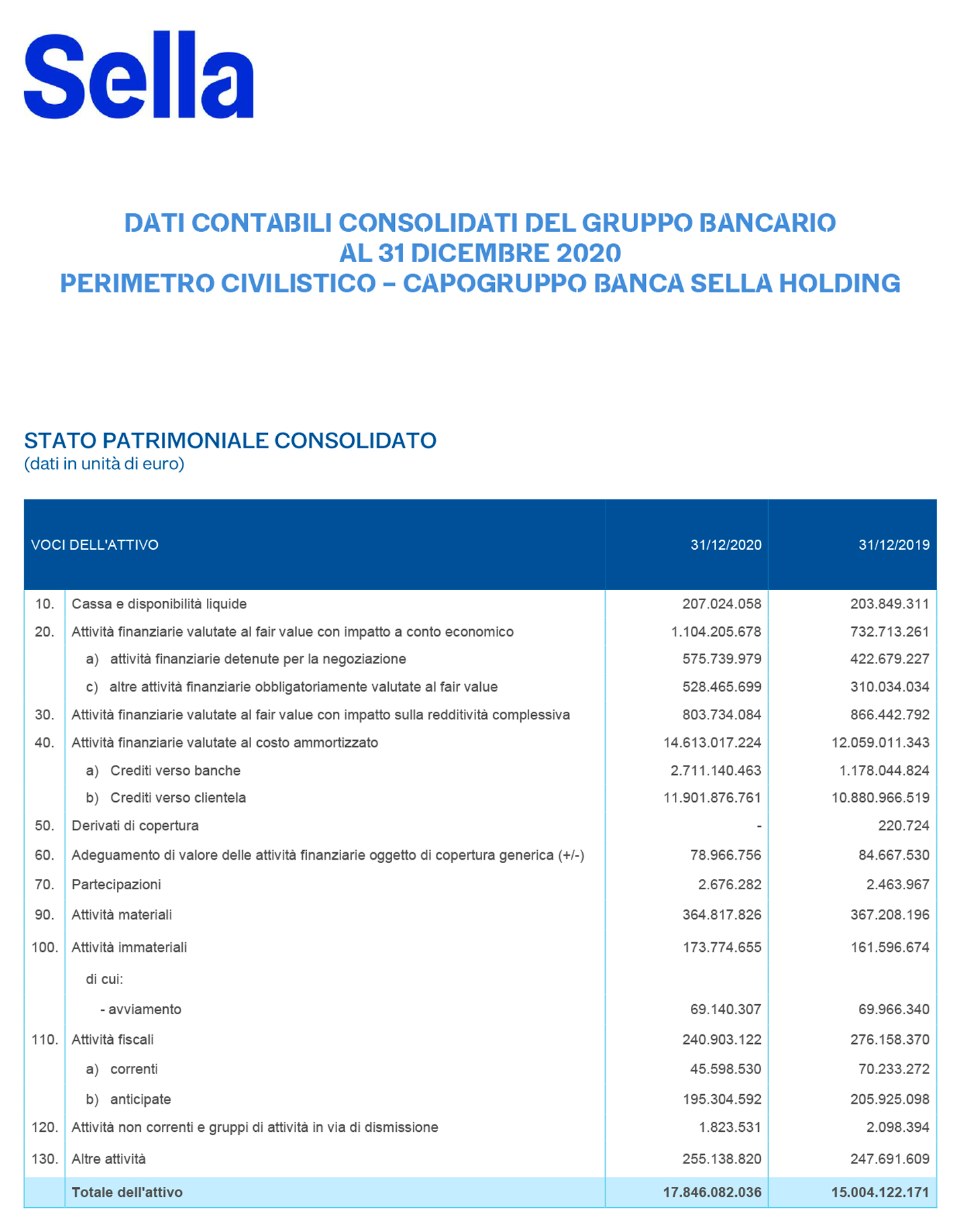 È stato inoltre approvato dal Consiglio d'amministrazione di Banca Sella Holding il progetto di bilancio consolidato al 31 dicembre 2020 del gruppo Sella, che si è chiuso con un utile netto di 29,6 milioni di euro, rispetto ai 34 milioni di euro dell'anno precedente, anche in questo caso principalmente per effetto delle maggiori rettifiche derivanti da una prudente valutazione del rischio di credito, senza le quali l'utile sarebbe stato in crescita.