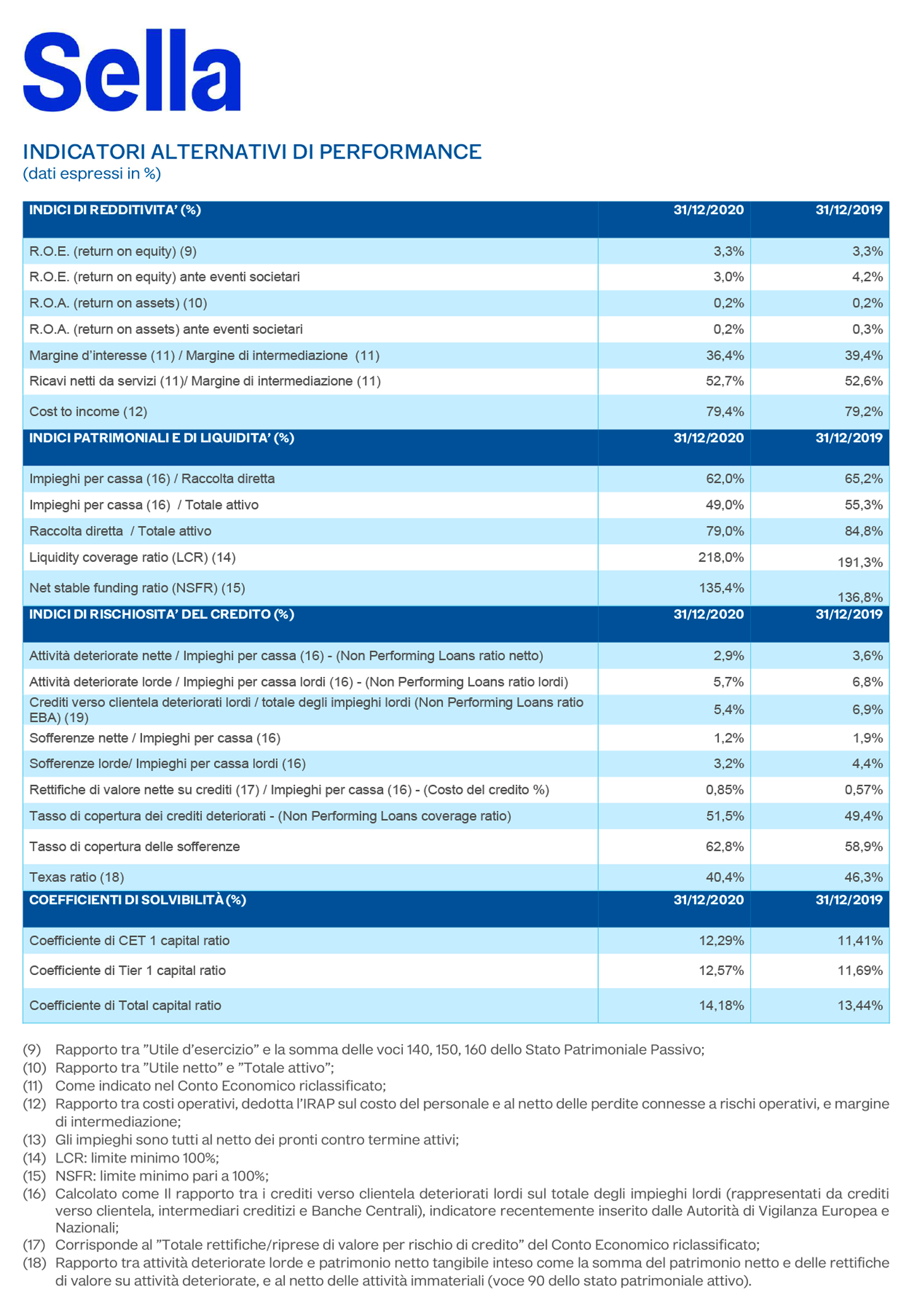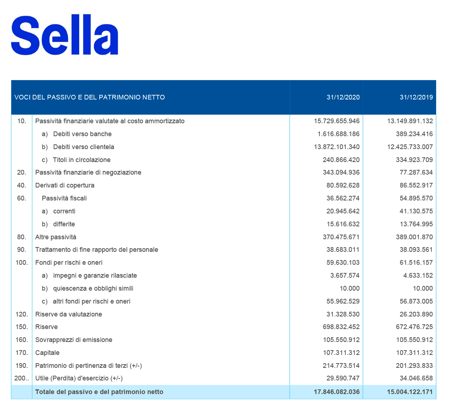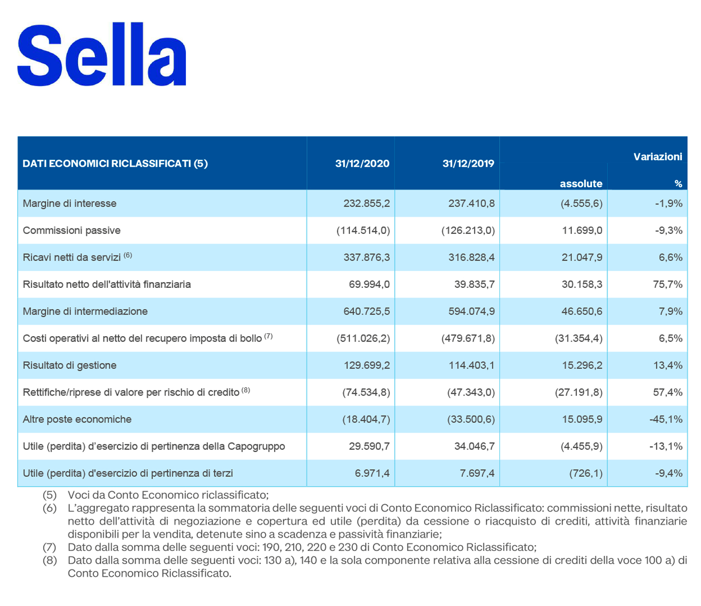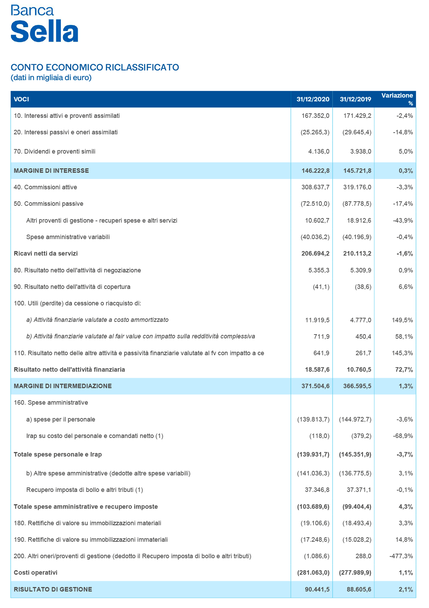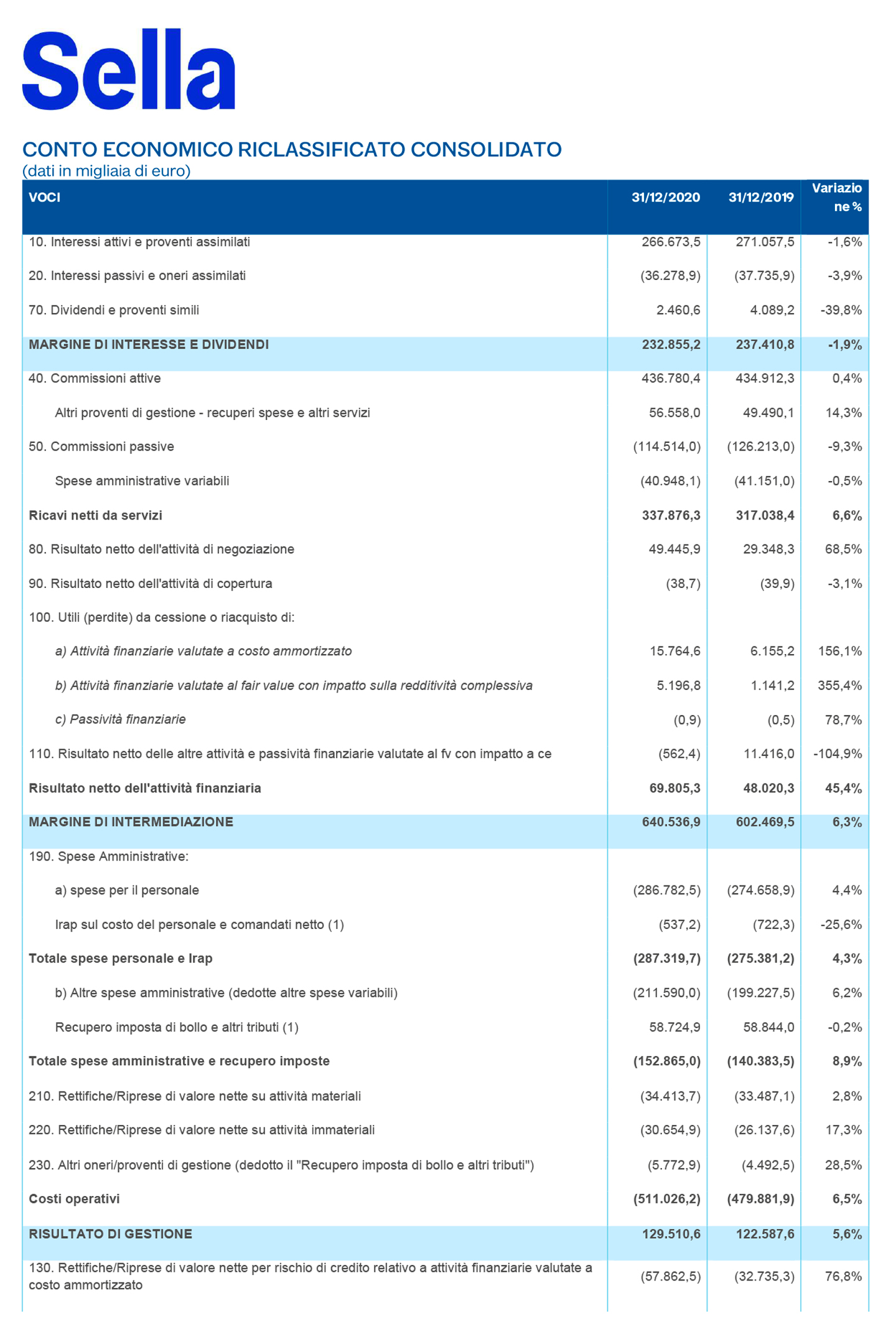 È stato inoltre approvato dal Consiglio d'amministrazione di Banca Sella Holding il progetto di bilancio consolidato al 31 dicembre 2020 del gruppo Sella, che si è chiuso con un utile netto di 29,6 milioni di euro, rispetto ai 34 milioni di euro dell'anno precedente, anche in questo caso principalmente per effetto delle maggiori rettifiche derivanti da una prudente valutazione del rischio di credito, senza le quali l'utile sarebbe stato in crescita.